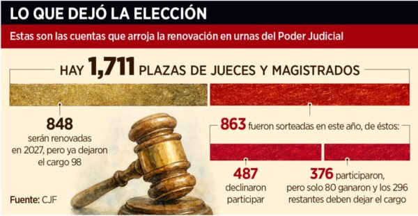 En medio de incertidumbre, este lunes entró en funciones un maltrecho Poder Judicial en todo el país, producto de la elección en las urnas el 1 de junio, y que funcionará con un 50 por ciento de jueces y magistrados suplentes. Un recuento del diario Reforma señala que, de mil 711 plazas en el Poder Judicial, solo 830 seguirán a cargo de juzgadores que llegaron a sus puestos por el sistema de designación por concursos de oposición que se aplicaba desde 1995. Este sistema, sin embargo, terminó con la Reforma Judicial para elegir jueces, magistrados y ministros por voto popular. De 863 plazas que salieron sorteadas para someterse a elección el 1 de junio, 487 juzgadores rechazaron participar en la elección y se han estado jubilando o renunciando desde finales del año pasado. De ese grupo, quienes aún trabajan, tuvieron que dejar el cargo el domingo, añadió Reforma en su recuento. ADIÓS MAGISTRADOS La mayoría de este grupo son 332 Magistrados de circuito, que por su antigüedad ya reunían los requisitos para jubilarse y acceder a una pensión complementaria, adicional a lo que paga el Issste. En ese mismo grupo de cargos sorteados y obligados a ir a urnas, 376 juzgadores participaron en la elección, pero solo 80 ganaron, el 21.2 por ciento de los que se apuntaron, entre ellos 25 de 145 magistrados y 55 de 231 jueces que fueron candidatos. Los 296 derrotados también tienen que dejar sus puestos, pues así lo ordena la Constitución. En otro bloque se encuentran las 848 plazas que no salieron sorteadas, y, por tanto, se someterán a elección hasta 2027. Pero incluso de esos juzgados ya también se fueron 93 magistrados y 5 jueces de distrito, es decir, hay 98 plazas vacantes que no podrán ser ocupadas por un titular sino hasta 2027, ya que el único método válido de nombramiento es el voto popular. En estos casos, secretarios en funciones deberán hacerse cargo de los órganos respectivos, lo que es habitual en el Poder Judicial, aunque no por periodos tan prolongados que, en este caso, serán de dos años. MUCHAS DUDAS En resumen, seguirán laborando 750 jueces y magistrados no sorteados para la elección de 2025, así como los 80 que ganaron en las urnas, el 48.5 por ciento del total de plazas. El resto las ocuparán, a partir de este lunes, jueces y magistrados electos en las urnas, muchos de ellos con experiencia como secretarios en el Poder Judicial o como jueces, magistrados o secretarios en tribunales estatales o administrativos, pero también muchos que no tienen antecedente de labor judicial. Hace tres semanas, integrantes del Consejo de la Judicatura Federal (CJF) intentaron retener a cien juzgadores que por mandato Constitucional deben salir el 1 de septiembre, pero que pidieron seguir laborando, alegando ser personas en “situación de vulnerabilidad”. El acuerdo respectivo, sin embargo, sólo tuvo cuatro de los cinco votos necesarios y fue desechado. (Fotos: Tomadas de Reforma y El Universal) Compartir Navegación de entradas Trabajo sin pausa contra reclutamientos forzosos Remesas tienen su peor caída desde el 2009