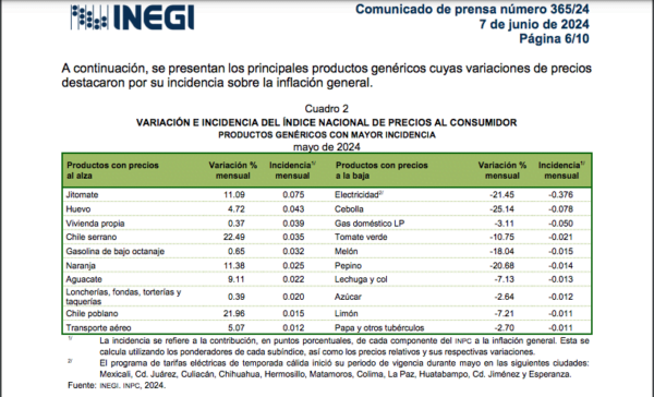 Por tercer mes consecutivo, la inflación se aceleró y en mayo llegó a 4.69 por ciento anual, desde 4.65 por ciento que marcó en abril. No obstante, el dato del Inegi estuvo muy por debajo de 4.82 por ciento anual estimado por analistas financieros. En su comparación mensual, el Índice Nacional de Precios al Consumidor (INPC) mostró una caída de -0.19 por ciento, más pronunciado que el pronóstico un descenso de -0.06 por ciento. Si bien los precios de algunos productos y servicios tuvieron bajas importantes como las tarifas de electricidad y ligeramente el gas doméstico, los precios al alza no frenan. POR LAS NUBES En la revisión de los precios de alimentos básicos, los chiles serranos y poblados volvieron a registrar fuertes alzas en comparación con la última quincena medida por el Inegi. Estos dos productos de la canasta básica subieron 22 por ciento en promedio, mientras que el jitomate y las naranjas tuvieron alzas similares de 11 por ciento. También tuvieron alzas el aguacate y el huevo con nueve y cuatro por ciento, respectivamente. Y BAJARON La medición del Inegi mostró que la cebolla fue el producto de la canasta básica que más bajó, junto con el pepino, con -25 y -20 por ciento. El INPC también registró bajas en productos como pepino, melón y tomate verde con -20.6, -18.04 y -10.75. Y en los energéticos y tarifas autorizadas por el gobierno se dio una inflación de 4.20 por ciento anual en mayo, desde 3.98 por ciento en abril. Sin embargo, los precios de los energéticos tuvieron una caída mensual de -4.37 por ciento, debido al programa de tarifas eléctricas de temporada cálida que inició en mayo en 11 ciudades del país. (Fotos: Tomadas de El Financiero y Reforma) Compartir Navegación de entradas Reforma al Poder Judicial va y el peso vuelve a devaluarse Aclara OMS que muerte de paciente en México no fue por gripe aviar