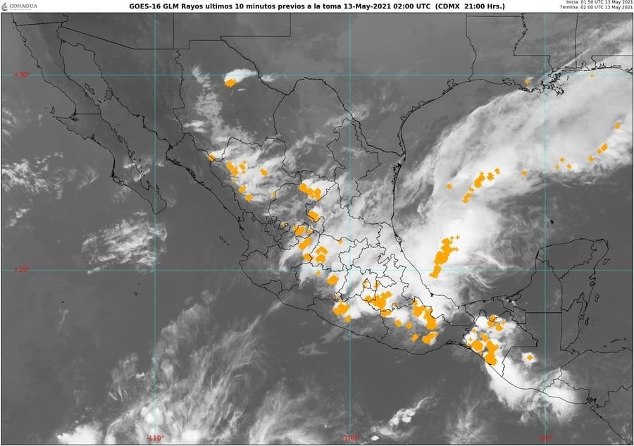 Posibilidad de tormentas eléctricas en Chihuahua, Coahuila, Nuevo León, Tamaulipas, San Luis Potosí, Aguascalientes, Zacatecas, Durango, Sinaloa, Nayarit, Jalisco, Colima, Michoacán, Guanajuato, Querétaro, Hidalgo, Veracruz, Puebla, Tlaxcala, Estado de México, Ciudad de México, Morelos, Guerrero, Oaxaca y Chiapas.