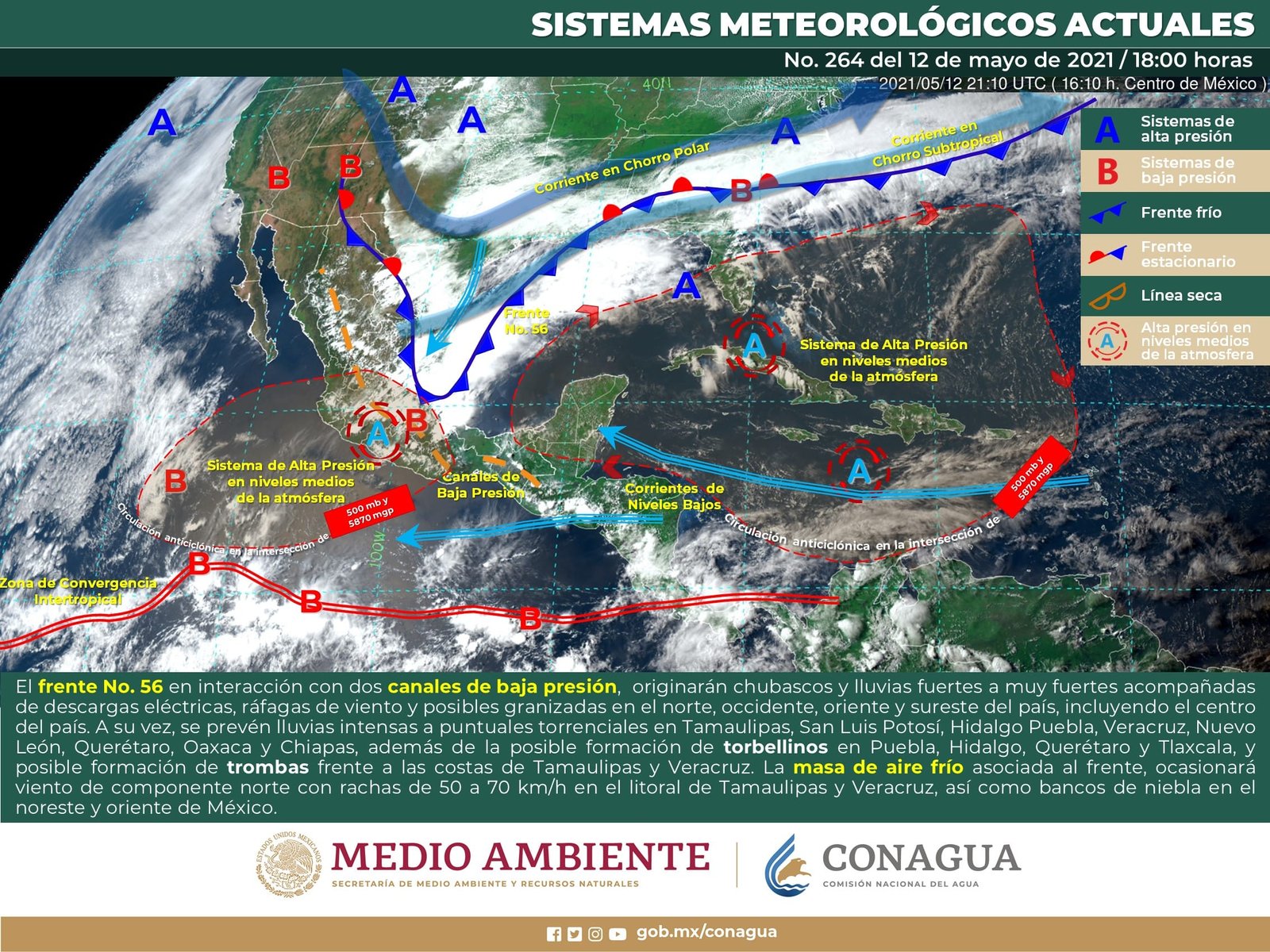 Para el resto del país, el SMN dijo que el frente No. 56 se extenderá sobre el norte, noreste y oriente del país continuará interactuando con canales de baja presión sobre el occidente y sureste de México.