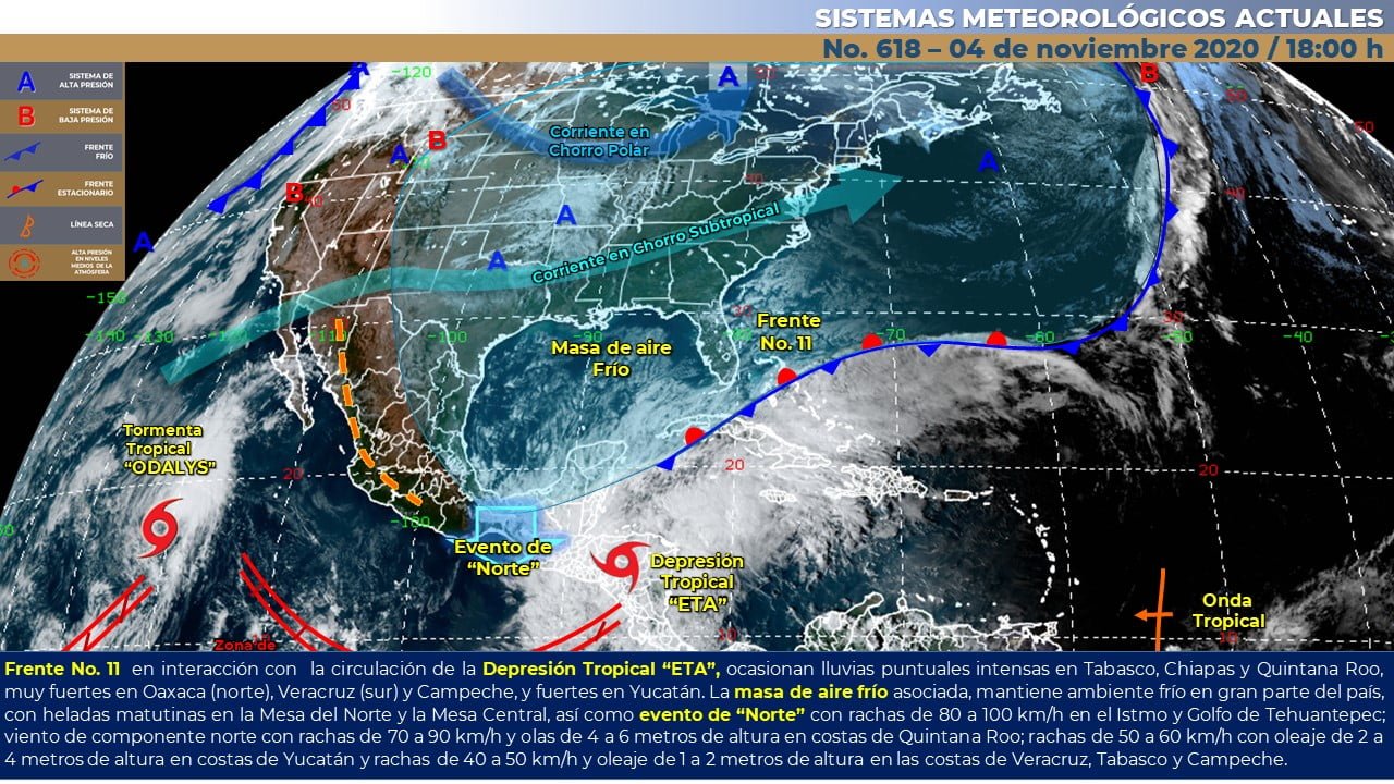 🔊 Escuchar esto Guanajuato seguirá este jueves con bajas temperaturas durante la madrugada y noche por los efectos del frente frío 11, dio a conocer el Servicio Meteorológico Nacional (SMN). De acuerdo con su último reporte, el organismo dependiente de la Comisión Nacional del Agua (Conagua) pronostica que para la Mesa Central del país habrá cielo despejado por la mañana, y medio nublado por la tarde e intervalos de chubascos en Puebla, así como lluvias aisladas en Hidalgo. Se espera de nuevo ambiente frío con heladas por la mañana y caluroso por la tarde. Viento de dirección variable de 15 a 30 km/h. SE MANTIENEN HELADAS EN GUANAJUATO El territorio de Guanajuato seguirá con los efectos del frente frío 11 y registrará máximas promedio de 25 grados con cielos despejados y rachas de viento nocturnas. Las temperaturas mínimas promedio en el estado serán de 5 grados durante la madrugada y noche que estarán acompañadas de rachas de viento. Sin embargo, en las zonas serranas y municipios del noreste de la entidad las mínimas serán de 3 a 4 grados. Para el resto del país, el SMN dijo que una nueva masa de aire frío ingresará al norte del país, reforzando los efectos del frente No. 11, por lo que se mantendrá el ambiente frío a muy frío durante la mañana y noche sobre sobre gran parte del territorio nacional. También seguirá el evento de “Norte” con rachas de 80 a 100 km/h en el Istmo y Golfo de Tehuantepec y con rachas de 60 a 70 km/h y oleaje de 1 a 2 metros de altura significativa en las costas de Veracruz y Tabasco. Asimismo, se prevén heladas matutinas en los estados de la Mesa del Norte y la Mesa Central y bancos de niebla matutinos en zonas altas del noreste, oriente y centro del país. LLUVIAS EN EL SUR DEL PAÍS La interacción de la nueva masa de aire frío con el ciclón tropical “Eta”, que se ubicará en el noreste de Guatemala, mantendrá el potencial de lluvias intensas a puntuales torrenciales sobre el sureste mexicano, además de originar vientos fuertes y oleaje elevado en la Península de Yucatán. Los sistemas meteorológicos mencionados ocasionarán los siguientes efectos: Lluvias intensas con lluvias puntuales torrenciales (150 a 250 mm) acompañadas de descargas eléctricas y rachas fuertes de viento durante las tormentas en los estados de Chiapas, Tabasco y Quintana Roo. Lluvias muy fuertes con lluvias puntuales intensas (75 a 150 mm) acompañadas de descargas eléctricas y rachas fuertes de viento durante las tormentas en Veracruz (sur), Oaxaca (oriente) y Campeche. Lluvias fuertes con lluvias puntuales muy fuertes (50 a 75 mm) acompañadas de descargas eléctricas y rachas fuertes de viento durante las tormentas en Yucatán. Intervalos de chubascos (5.1 a 25 mm) acompañados de descargas eléctricas y rachas fuertes de viento durante las tormentas en Puebla. Lluvias aisladas (0.1 a 5 mm) en Tamaulipas, San Luis Potosí e Hidalgo. Evento de “Norte” con rachas de 80 a 100 km/h en el Istmo y Golfo de Tehuantepec, de 60 a 70 km/h en costas de Veracruz y Tabasco. Viento con rachas de 60 a 70 km/h en costas de Campeche, Yucatán y Quintana Roo. Oleaje de 4 a 6 metros de altura significativa en costa de Quintana Roo, de 3 a 5 metros de altura significativa en Golfo de Tehuantepec y costa de Yucatán, de 2 a 4 metros de altura significativa en las costas de Tabasco y Campeche, y de 1 a 3 metros de altura significativa en costa sur de Veracruz. Temperaturas máximas de 35°C a 40°C en Baja California, Baja California Sur, Sonora, Sinaloa y Nayarit. Temperaturas mínimas para la madrugada del viernes de -5 a 0°C con heladas en las zonas montañosas de Chihuahua, Durango, Zacatecas, Estado de México, Hidalgo, Tlaxcala, Puebla y Veracruz. Temperaturas mínimas para la madrugada del viernes de 0 a 5°C y posibles heladas en zonas montañosas de Baja California, Sonora, Coahuila, Nuevo León, Tamaulipas, San Luis Potosí, Aguascalientes, Jalisco, Michoacán, Guanajuato, Querétaro, Ciudad de México y Oaxaca. Compartir