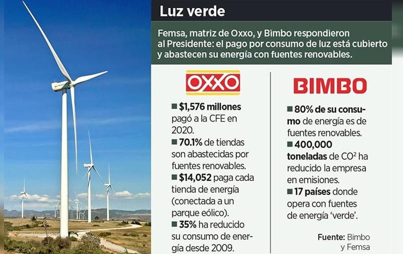 🔊 Escuchar esto La respuesta es contundente y con cifras. Luego de que el presidente Andrés Manuel López Obrador afirmó el viernes que las empresas pagan menos por la luz que una casa de clase baja o media, y amenazó con revelar cuánto pagan y “llegar hasta las últimas consecuencias”, compañías como Oxxo y Bimbo refutaron los dichos del tabasqueño con cifras y estados de cuenta. En su mañanera del viernes, López Obrador aseguró que varias de esas empresas presentaron amparos contra la reciente reforma eléctrica a fin de conservar “grandes subsidios” en la electricidad. Engañaban que el subsidio se lo daban al consumidor domiciliario, a una familia. No, los grandes subsidios en la electricidad son para las empresas comerciales. Hoy (ayer) estaba yo enterándome que se amparó Walmart y se amparó Bimbo por la reforma eléctrica”, dijo molesto el presidente el viernes. Sin embargo, esos recursos legales no son contra la reforma impulsada por AMLO, sino que han sido contra medidas previas del Gobierno actual, como el aumento de tarifas de transmisión de la Comisión Reguladora de Energçia (CRE) a productores privados, conocido como electrolinazo, y la prohibición para incluir a nuevos socios en los permisos para plantas de autoabastecimiento, recordó el diario Reforma. “Paga más una familia de clase popular o de clase media que lo que paga un Oxxo de luz”, insistió el tabasqueño sin dar cifras. “Paga mucho más la dueña de abarrotes de una colonia, de un barrio, de un pueblo, que lo que paga un Oxxo”, continuó, “y ahora que sean para Bimbo y que sean para Walmart, pues vamos a dar a conocer cuánto pagaban. O por qué quieren mantener esos privilegios”. FEMSA PAGA MÁS DE MIL MILLONES Ante estas afirmaciones, el consorcio FEMSA dio a conocer que en el 2020 su cadena de tiendas Oxxo pagó mil 576 millones de pesos por concepto de electricidad a la Comisión Federal de Electricidad (CFE). En promedio, dijo, cada tienda conectada a un parque eólico paga 14 mil 52 pesos al mes por energía renovable. “Actuamos siempre apegados a la legalidad”, señaló en un comunicado. “Los contratos correspondientes son legales y legítimos”, añadió el conglomerado con sede en Monterrey. A su vez, Bimbo informó que paga en su totalidad sus tarifas eléctricas conforme a la legislación aplicable en cada uno de los países en donde opera y destacó que, al cierre del 2020, el 80 por ciento de la energía eléctrica consumida por la empresa provenía de fuentes limpias. (Foto: Tomada del diario Reforma) Compartir
