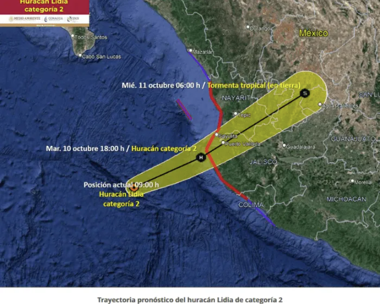 “Lidia” se intensificó a huracán categoría 2, reportó el Servicio Meteorológico Nacional (SMN), y apunta a los estados de Jalisco y Nayarit con lluvias torrenciales. El organismo dependiente de la Conagua dijo que la amplia circulación de “Lidia” refuerza las lluvias intensas a puntuales torrenciales en los estados de: Baja California Sur Sinaloa Nayarit Jalisco Colima Michoacán Guerrero El fenómeno está acompañado de viento con rachas fuertes y oleaje elevado en costas de dichas regiones. Durante la tarde-noche de este martes, “Lidia” ingresará a tierra en las inmediaciones entre Jalisco y Nayarit. Su amplitud llegará hasta los estados de Guanajuato y Aguascalientes con lluvias torrenciales, añadió el SMN. MODIFICA TRAYECTORIA El sistema se encuentra, en su distancia al lugar más cercano, a 260 km al oeste-suroeste de Cabo Corrientes, Jalisco, y a 315 km al oeste-suroeste de Puerto Vallarta, Jalisco. El SMN apuntó que se modifica zona de prevención por efectos de huracán desde Manzanillo, Colima, hasta el Roblito, Nayarit, incluidas las Islas Marías, Nayarit. Su desplazamiento actual es hacia el este-noreste (70°) a 24 km/h y mantiene vientos máximos sostenidos de 155 km/h y rachas de 195 km/h. Además, se prevé viento con rachas de 120 a 140 km/h y oleaje de 5 a 7 metros de altura en costas de Nayarit y Jalisco. Las autoridades pidieron extremar precauciones a la población en general en las zonas de los estados mencionados por lluvias, viento y oleaje (incluyendo la navegación marítima) y atender las recomendaciones emitidas por las autoridades del Sistema Nacional de Protección Civil, en cada entidad. Compartir Navegación de entradas Pide a colaboradores dar lo máximo hasta el último día Listos los operativos de seguridad para el Festival Cervantino