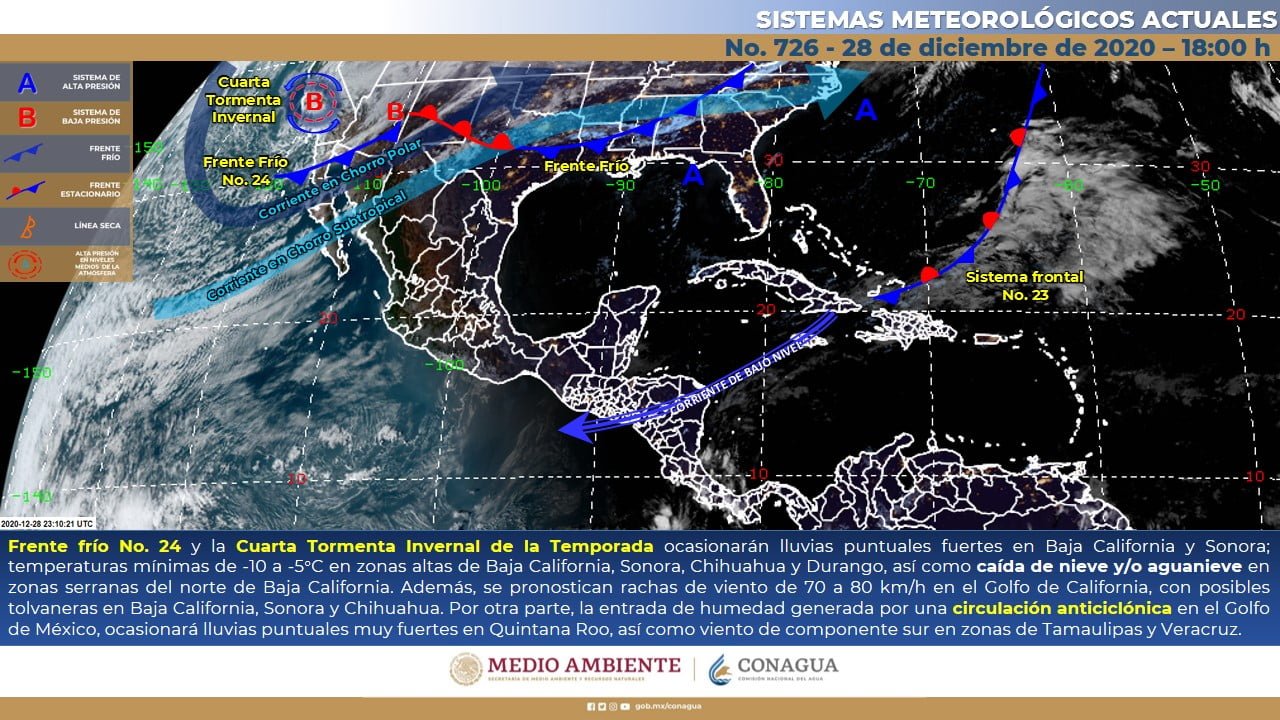 🔊 Escuchar esto Guanajuato tendrá este martes un ligero aumento de temperaturas, aunque las mínimas en toda la entidad seguirán por debajo de los 5 grados, dio a conocer el Servicio Meteorológico Nacional (SMN). De acuerdo con su último reporte, el organismo dependiente de la Comisión Nacional del Agua (Conagua) pronostica que la Mesa Central del país registrará cielo parcialmente nublado durante la tarde, sin posibilidad de lluvia en la región. Se esperan además bancos de niebla matutinos y ambiente muy frío con heladas matutinas en zonas serranas. CONTINÚAN HELADAS EN GUANAJUATO El reporte del SMN precisó que Guanajuato tendrá temperaturas máximas entre 23 y 24 grados a lo largo del día con nula probabilidad de lluvia. No obstante, las mínimas en la entidad se ubicarán entre los 3 y 4 grados durante la madrugada y noche. Los municipios de San Miguel de Allende, Pénjamo, León, Irapuato, Salamanca, Celaya, Guanajuato capital y Dolores Hidalgo tendrán mínimas de 3 y 4 grados, mientras que las zonas altas podrían tener 2 grados. LLUVIAS Y FRÍO EN EL NORTE Para el resto del país, el SMN dijo que el frente frío No. 24 y la Cuarta Tormenta Invernal de la temporada se desplazarán sobre el noroeste y norte del país. Estos fenómenos provocarán lluvias puntuales fuertes en Baja California (norte), ambiente de muy frío a gélido y rachas fuertes de viento, sobre el noroeste de México y Mesa del Norte. Además de la posibilidad de caída de nieve o aguanieve en zonas montañosas de Baja California (norte), Sonora (noreste y oriente), Chihuahua (occidente y norte) y Durango (noroeste). HUMEDAD EN EL NORESTE Sistema de alta presión se mantendrá sobre el Golfo de México, generando la entrada de humedad hacia el noreste, oriente y sureste del país, incluyendo la Península de Yucatán, originando lluvias con intervalos de chubascos sobre estas regiones. Se espera viento de componente sur (surada) con rachas fuertes sobre el noreste de la República Mexicana. En el resto del territorio mexicano se pronostica escasa probabilidad de lluvia. Los sistemas meteorológicos ocasionarán este martes: Intervalos de chubascos con lluvias puntuales fuertes (25 a 50 mm) y rachas fuertes de viento durante las tormentas en Baja California (norte). Intervalos de chubascos (5.1 a 25 mm) acompañados de descargas eléctricas y rachas fuertes de viento durante las tormentas en Sonora, Chihuahua, Coahuila (norte), Sinaloa (sur), Guerrero, Oaxaca, Chiapas y Quintana Roo. Lluvias aisladas (0.1 a 5.0 mm) en Baja California Sur, Durango, Nuevo León, Tamaulipas, Veracruz, Tabasco, Campeche y Yucatán. Posible caída de nieve y/o aguanieve en zonas montañosas de Baja California (norte), Sonora (noreste y oriente), Chihuahua (occidente y norte) y Durango (noroeste). Viento con rachas de 70 a 90 km/h en Sonora, Chihuahua, Durango y Zacatecas. Viento de componente sur (Surada) con rachas de 60 a 70 km/h en Coahuila, Nuevo León y Tamaulipas. Viento de componente norte con rachas de 50 a 60 km/h en el Istmo y Golfo de Tehuantepec. Viento con rachas de 50 a 60 km/h en Baja California, Baja California Sur, Guanajuato, Aguascalientes, San Luis Potosí. Oleaje de 2 a 4 metros de altura significativa en la costa occidental de Baja California y de 1 a 2.5 metros de altura en las costas de Tamaulipas y norte de Veracruz. Temperaturas máximas de 35 a 40°C en Michoacán y Guerrero. Temperaturas mínimas para la madrugada del miércoles de -10 a -15°C con heladas en las zonas montañosas de Chihuahua y Durango. Temperaturas mínimas para la madrugada del miércoles de -10 a -5°C con heladas en las zonas montañosas de Baja California y Sonora. Temperaturas mínimas para la madrugada del miércoles de -5 a 0°C con heladas en zonas montañosas de Coahuila, Nuevo León y Zacatecas. Temperaturas mínimas para la madrugada del miércoles de 0 a 5°C y posibles heladas en las zonas montañosas de Tamaulipas, San Luis Potosí, Aguascalientes, Jalisco, Querétaro, Hidalgo, Tlaxcala, Ciudad de México, Estado de México, Guanajuato, Puebla y Veracruz. Compartir