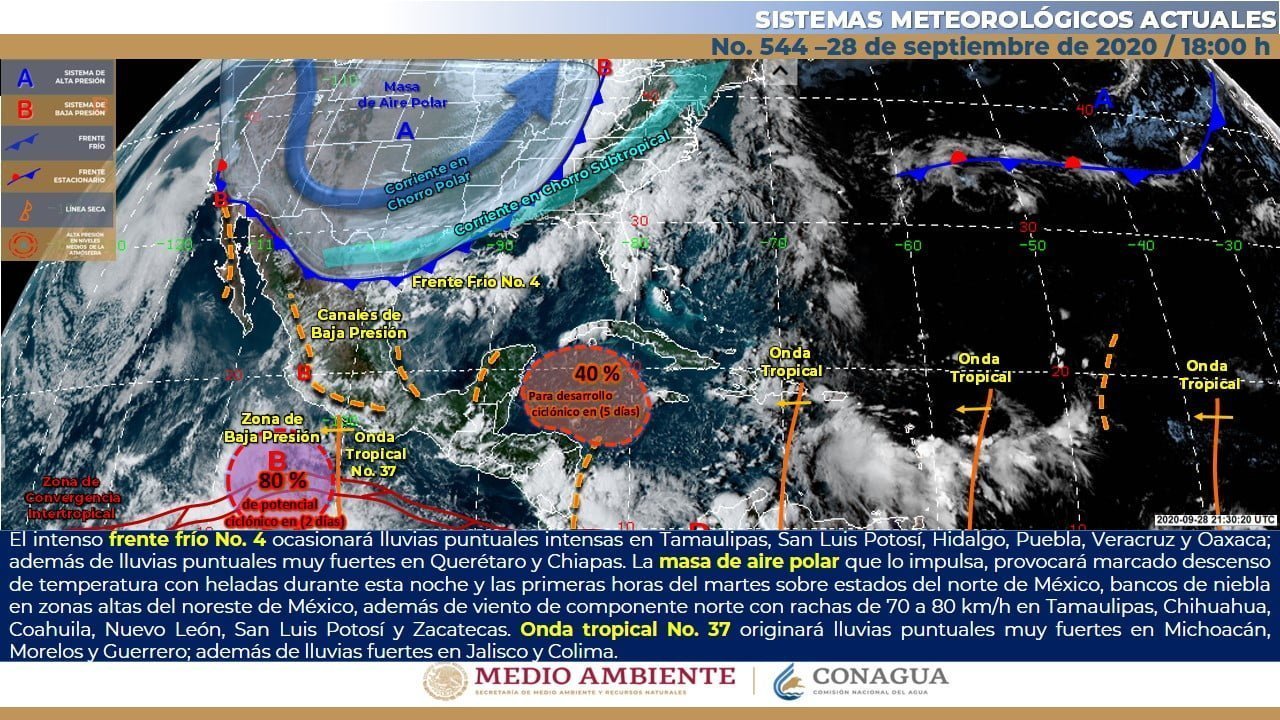 🔊 Escuchar esto Este martes, una masa de aire frío que entra por el norte del país tendrá repercusiones en Guanajuato, principalmente en zonas altas, dio a conocer el Servicio Meteorológico Nacional (SMN). De acuerdo con su último reporte, el organismo dependiente de la Comisión Nacional del Agua (Conagua) pronostica que para la Mesa Central del país habrá cielo nublado con lluvias puntuales intensas en Puebla; lluvias puntuales fuertes en Hidalgo, Tlaxcala y Morelos; chubascos en Querétaro y lluvias aisladas en Guanajuato. Ambiente frío por la mañana con bancos de niebla en zonas altas de la región. Ambiente templado por la tarde. Viento de componente norte de 15 a 30 km/h con rachas de 60 km/h en Guanajuato, Tlaxcala y Puebla. Todos los municipios de Guanajuato tienen apenas 5 por ciento de probabilidad de lluvia, con máximas promedio de 24 grados y nublados parciales durante la tarde. Las temperaturas mínimas promedio serán de 11 grados, aunque las zonas montañosas y las del noreste del estado podrían tener 5 grados durante la madrugada y noche, según el reporte. HELADAS EN VARIAS ZONAS Para el resto del país, el SMN dijo que el intenso frente frío No. 4 recorrerá el oriente y sureste del territorio nacional, ocasionará lluvias puntuales extraordinarias en Veracruz, Chiapas y Tabasco, torrenciales en Oaxaca, intensas en Puebla, Guerrero y Campeche, muy fuertes en Yucatán y Quintana Roo, y fuertes en Hidalgo, Tlaxcala, Estado de México y Morelos, dichas lluvias estarán acompañadas de descargas eléctricas y posible caída de granizo. Por su parte, la masa de aire frío que impulsa al frente provocará marcado descenso de temperatura sobre entidades del norte, noreste, oriente y centro del país, heladas matutinas en la Mesa del Norte y la Mesa Central, bancos de niebla en el noreste y oriente de la República Mexicana, así como evento de “Norte” muy fuerte a intenso en el litoral del Golfo de México, desde Tamaulipas hasta Yucatán, además del Istmo y Golfo de Tehuantepec. FRÍO INTENSO Se prevén temperaturas mínimas por debajo de 5°C y posibilidad de heladas sobre entidades del norte, centro y oriente del territorio nacional. Asimismo, se pronostica una disminución en el potencial de lluvias en el norte, noreste, occidente y centro de la República Mexicana a partir de este día. Se esperan así este martes lluvias torrenciales con lluvias puntuales extraordinarias (mayores a 250 mm) acompañadas de descargas eléctricas, granizadas y rachas fuertes de viento durante las tormentas en los estados de Veracruz, Chiapas y Tabasco. Lluvias intensas con lluvias puntuales torrenciales (150 a 250 mm) acompañadas de descargas eléctricas, granizadas y rachas fuertes de viento durante las tormentas en Oaxaca. Lluvias muy fuertes con lluvias puntuales intensas (75 a 150 mm) acompañadas de descargas eléctricas, granizadas y rachas fuertes de viento durante las tormentas en Puebla, Guerrero y Campeche. Lluvias fuertes con lluvias puntuales muy fuertes (50 a 75 mm) acompañadas de descargas eléctricas, granizadas y rachas fuertes de viento durante las tormentas en Michoacán, Yucatán y Quintana Roo. Intervalos de chubascos con lluvias puntuales fuertes (25 a 50 mm) acompañados de descargas eléctricas, granizadas y rachas fuertes de viento durante las tormentas en Jalisco, Colima, Hidalgo, Tlaxcala, Estado de México y Morelos. Intervalos de chubascos (5.1 a 25 mm) acompañados de descargas eléctricas, granizadas y rachas fuertes de viento durante las tormentas en Nayarit, Querétaro y Ciudad de México. Evento de “Norte” con rachas de 100 a 120 km/h y oleaje de 3 a 5 metros de altura significativa en la costa de Veracruz y Golfo de Tehuantepec, con rachas de 70 a 80 km/h y oleaje de 2 a 3 metros de altura significativa en las costas de Tamaulipas y Tabasco, con rachas de 50 a 60 km/h y oleaje de 1 a 2 metros de altura significativa en las costas de Campeche y Yucatán (occidente), y rachas de 100 a 120 km/h en el Istmo de Tehuantepec. Temperaturas máximas de 40°C a 45°C en Baja California Sur, Baja California, Sonora y Yucatán. Temperaturas máximas de 35°C a 40°C en Sinaloa, Nayarit, Chiapas, Campeche y Quintana Roo. Temperaturas mínimas para el miércoles de 0 a 5°C y posibles heladas en las zonas montañosas de los estados de Chihuahua, Coahuila, Nuevo León, Tamaulipas, San Luis Potosí, Aguascalientes, Zacatecas, Durango, Jalisco, Michoacán, Guanajuato, Querétaro, Hidalgo, Veracruz, Puebla, Tlaxcala, Estado de México y Oaxaca. Compartir