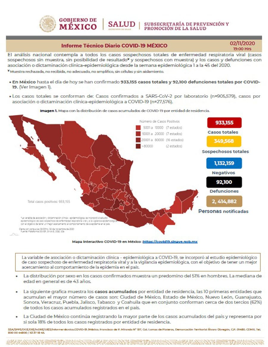 🔊 Escuchar esto La noche de este lunes, la Secretaría de Salud reportó 205 muertes más por coronavirus Covid-19 en México, con lo que suman 92 mil 100, mientras que el número de casos acumulados suma 933 mil 155, 3 mil 763 que el domingo. La Secretaría de Salud de Guanajuato (SSG) dio a conocer que el número de personas fallecidas en el estado llegó a 3 mil 435, 23 más que el domingo. En el informe técnico diario de la Secretaría de Salud federal, del total de la epidemia 28 mil 51 son casos activos, es decir, personas que manifestaron síntomas durante los últimos 14 días y quienes podrían transmitir el virus. “La Ciudad de México es la entidad con mayor número de casos activos (más de 3 mil), seguida de Nuevo León, Guanajuato, Coahuila, Durango, Jalisco”, añadió el reporte. Al corte de este 2 de noviembre, suman 349 mil 568 casos sospechosos y 687 mil 420 recuperados de la enfermedad. REGRESA OTRO ESTADO AL ROJO Por su parte, el estado de Durango anunció que a partir de este martes regresa al semáforo rojo y al menos hasta el 17 de noviembre como consecuencia de un aumento en los casos positivos, la demanda hospitalaria y la velocidad de contagio. Según informó el gobernador estatal José Rosas Aispuro Torres, la decisión de modificar el nivel de riesgo epidemiológico en Durango fue tomada junto con los alcaldes de la entidad y la Secretaría de Salud federal. El cambio comprende medidas como la suspensión de toda actividad económica no considerada como esencial. Los hoteles operarán con una ocupación máxima de 25% y sin áreas comunes. Los parques, plazas y espacios públicos permanecerán cerrados. Los restaurantes y cafeterías podrán atender al 25% de su capacidad y los puestos de comida sólo podrán ofrecer servicio para llevar. GUANAJUATO SUPERA LOS 51,100 CASOS La Secretaría de Salud de Guanajuato (SSG) informó en su última actualización que se registraron 244 casos positivos más en las últimas 24 horas para llegar a 51 mil 106. De esta última cifra, 50 mil 950 han sido por transmisión comunitaria, mientras que los casos bajo investigación suman 3 mil 249. En cuanto a decesos, el total llegó a 3 mil 435 en el último día, 23 más, siendo León el municipio que más casos registró. Las defunciones por municipio quedan así: León 1,261 Irapuato 328 Celaya 318 Salamanca 204 Silao 176 Guanajuato capital 95 Sn. Luis de la Paz 75 Cortazar 74 Sn. Fco. Del Rincón 68 Dolores Hidalgo 65 Valle de Santiago 62 Pénjamo 55 Salvatierra 53 Juventino Rosas 48 Acámbaro 43 Apaseo el Grande 40 Villagrán 40 Romita 38 San Felipe 38 Sn. Miguel de Allende 36 Abasolo 33 Purísima del Rincón 28 Yuriria 26 Comonfort 25 San José Iturbide 23 Manuel Doblado 22 Uriangato 21 Moroleón 20 Apaseo el Alto 18 Jaral del Progreso 17 Ocampo 12 Cuerámaro 11 Huanímaro 9 Jerécuaro 8 Sn. Diego de la Unión 8 Doctor Mora 7 Tarimoro 7 Santiago Maravatío 5 Victoria 5 Tarandacuao 4 Tierra Blanca 4 Xichú 3 Pueblo Nuevo 2 Compartir