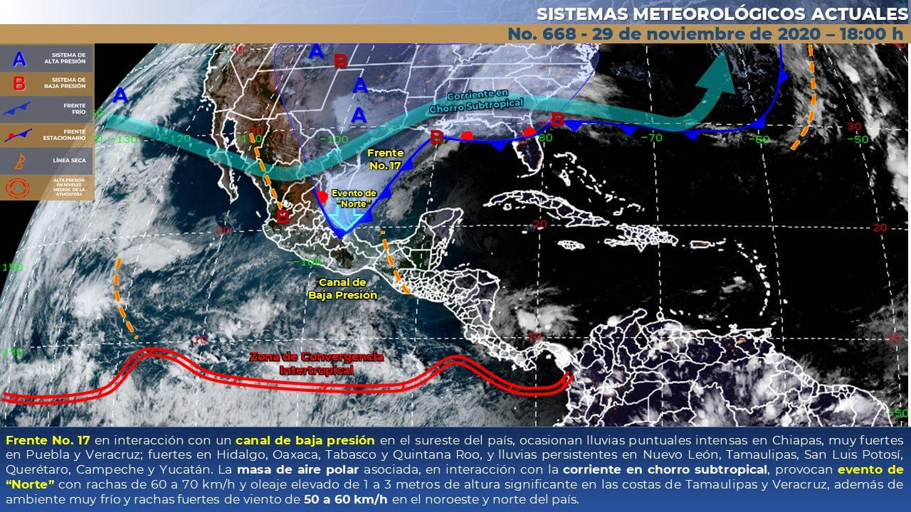 🔊 Escuchar esto Guanajuato sentirá este lunes los efectos del frente frío 17 en el norte del país con una baja drástica de los termómetros, dio a conocer el Servicio Meteorológico Nacional (SMN). De acuerdo con su último reporte, el organismo dependiente de la Comisión Nacional del Agua (Conagua) pronostica que la Mesa Central del país tendrá cielo medio nublado durante el día con lluvias puntuales muy fuertes en Puebla, así como lluvias aisladas en Guanajuato, Querétaro, Hidalgo, Tlaxcala y Morelos. Se esperan bancos de niebla en zonas montañosas y ambiente frío al amanecer con posibles heladas. Viento de dirección variable de 15 a 30 km/h. HELADAS EN TERRITORIO GUANAJUATENSE El reporte indicó que la mayor parte de Guanajuato tendrá algunos nublados durante el día e incluso probabilidad de chubascos ligeros. Las temperaturas máximas promedio en el estado serán de 22 a 24 grados, aunque las zonas del noreste como San Luis de la Paz, San Miguel de Allende, Victoria, Doctor Mora y San Felipe tendrán máximas de 18 grados. En estas regiones podrían presentarse las ligeras lluvias, añadió el reporte, que precisó que las mínimas ahí serán de 2 a 3 grados. Los municipios de León, Guanajuato capital, Dolores Hidalgo, Comonfort, Salamanca e Irapuato tendrán mínimas de 5 a 6 grados durante la madrugada y noche. FRENTE FRÍO CON LLUVIAS Para el resto del país, el SMN El frente frío No. 17 se extenderá sobre el sureste del territorio nacional, ocasionará lluvias fuertes a muy fuertes en Puebla, Yucatán y Quintana Roo, Veracruz y Campeche, y torrenciales en Oaxaca, Chiapas y Tabasco. La masa de aire polar que impulsa al frente, en interacción con la corriente en chorro subtropical, provocarán ambiente muy frío sobre el noroeste y norte de México. También traerán descenso de temperatura y bancos de niebla matutinas sobre entidades del noreste, oriente y centro del país, heladas durante la madrugada en zonas serranas de la Mesa del Norte y la Mesa Central, así como evento de “Norte” muy fuerte a intenso en el litoral del Golfo de México, Istmo y Golfo de Tehuantepec. Los sistemas meteorológicos ocasionarán este lunes: Lluvias intensas con lluvias puntuales torrenciales (150 a 250 mm) acompañadas de descargas eléctricas, granizadas y rachas fuertes de viento durante las tormentas en los estados de Oaxaca, Chiapas y Tabasco. Lluvias muy fuertes con lluvias puntuales intensas (75 a 150 mm) acompañadas de descargas eléctricas, granizadas y rachas fuertes de viento durante las tormentas en Veracruz (sur) y Campeche. Lluvias fuertes con lluvias puntuales muy fuertes (50 a 75 mm) acompañadas de descargas eléctricas, granizadas y rachas fuertes de viento durante las tormentas en Puebla y Quintana Roo. Intervalos de chubascos con lluvias puntuales fuertes (25 a 50 mm) acompañadas de descargas eléctricas y rachas fuertes de viento durante las tormentas en Guerrero y Yucatán. Intervalos de chubascos (5.1 a 25 mm) acompañados de descargas eléctricas y rachas fuertes de viento durante las tormentas en Michoacán y Estado de México. Lluvias aisladas (0.1 a 5.0 mm) en Tamaulipas, Guanajuato, Querétaro, Hidalgo, Tlaxcala, Ciudad de México y Morelos. Evento de “Norte” con rachas de viento de 80 a 100 km/h en la costa centro y sur de Veracruz, Istmo y Golfo de Tehuantepec, con rachas de 60 a 80 km/h en las costas de Tabasco y Campeche, y con rachas de 50 a 60 km/h en el litoral de Tamaulipas y Yucatán. Viento con rachas de 50 a 60 km/h y tolvaneras en Mar de Cortés. Oleaje de 3 a 5 metros de altura significativa en el litoral sur de Veracruz y Golfo de Tehuantepec, de 2 a 4 metros de altura significativa en las costas de Tabasco y Campeche. Temperaturas máximas de 35 a 40°C en Michoacán y Guerrero. Temperaturas mínimas para la madrugada del martes de -10 a -5°C con heladas en zonas montañosas de Sonora, Chihuahua, Durango y Coahuila. Temperaturas mínimas para la madrugada del martes de -5 a 0°C con heladas en zonas montañosas de Baja California, Nuevo León, Tamaulipas, San Luis Potosí, Zacatecas, Aguascalientes, Guanajuato, Querétaro, Hidalgo y Estado de México. Temperaturas mínimas para la madrugada del martes de 0 a 5°C y posibles heladas en zonas montañosas de Jalisco, Michoacán, Tlaxcala, Puebla, Veracruz y Oaxaca. Compartir