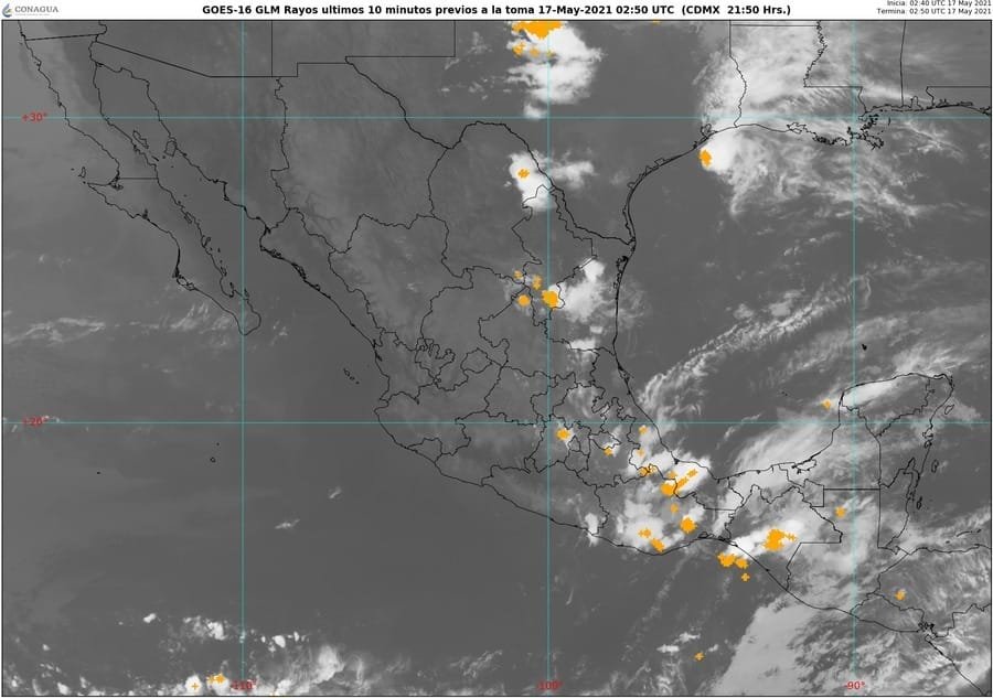 Posibilidad de tormentas eléctricas en Coahuila, Nuevo León, Tamaulipas, San Luis Potosí, Michoacán, Querétaro, Hidalgo, Veracruz, Puebla, Tlaxcala, Estado de México, Ciudad de México, Morelos, Guerrero, Oaxaca, Chiapas, Tabasco, Campeche, Yucatán y Quintana Roo.