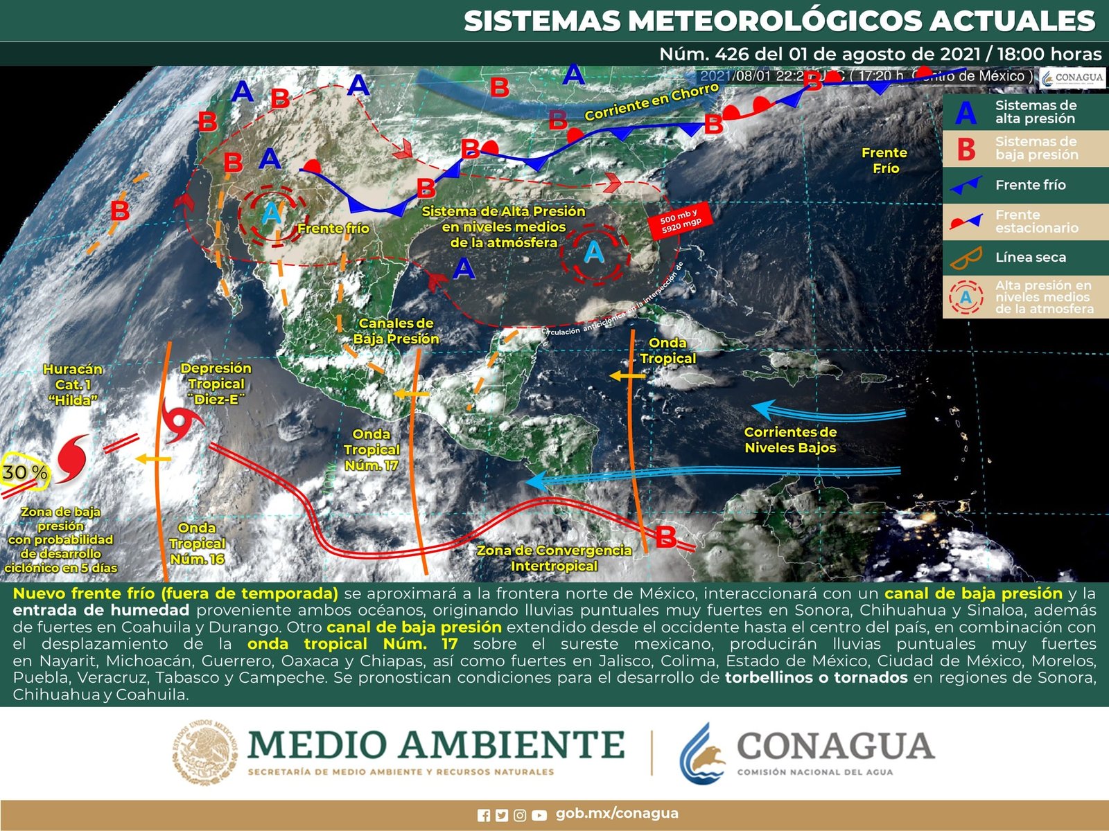 🔊 Escuchar esto Este lunes, Guanajuato tendrá elevadas temperaturas durante el día alcanzando los termómetros hasta los 28 grados, aunque con probabilidad de lluvias nocturnas en varias zonas de la entidad, dio a conocer el Servicio Meteorológico Nacional (SMN). De acuerdo con su último reporte, el organismo dependiente de la Comisión Nacional del Agua (Conagua) pronostica que la Mesa Central del país tendrá cielo parcialmente nublado durante el día y nublado por la tarde con lluvias puntuales muy fuertes en Puebla, fuertes en Guanajuato, Morelos, Hidalgo y Tlaxcala, todas con descargas eléctricas y con posible caída de granizo en Tlaxcala y Puebla, además de lluvias aisladas en Querétaro. Habrá bancos de niebla matutinos en zonas serranas de la región, mientras que el viento de dirección variable de 15 a 30 km/h llegará acompañado de rachas de hasta 50 km/h en zonas de tormenta. CALOR Y LLUVIA EN GUANAJUATO El reporte indica que Guanajuato tendrá alta humedad a lo largo del día con temperaturas máximas de 28 a 29 grados a lo largo del día y mínimas de13 y 14 grados. Los municipios del noreste tienen la más alta probabilidad de lluvia nocturna. Ahí se prevén máximas de 22 grados con mínimas de 12. Demarcaciones como León, Guanajuato capital, Comonfort, Dolores Hidalgo, Celaya, Salamanca e Irapuato tienen probabilidad de 45-50 por ciento de lluvia. Las máximas en estas zonas serán de 28 grados y mínimas de 13-14 durante la noche y madrugada del martes. FRÍO Y LLUVIAS EN EL NORTE Para el resto del país, el SMN dijo que nuevo frente frío (fuera de temporada) se extenderá cerca de la frontera norte de México. Este fenómeno, en interacción con un canal de baja presión sobre el noreste del territorio nacional, ocasionarán chubascos y lluvias fuertes acompañadas de descargas eléctricas y posibles granizadas sobre las regiones mencionadas, así como la posible formación de torbellinos o tornados en el norte de Coahuila. Un canal de baja presión en interacción con divergencia en altura prevalecerá sobre el noroeste y occidente del país ocasionando chubascos y lluvias fuertes a muy fuertes acompañadas de descargas eléctricas y posibles granizadas en dichas regiones. SIGUE ONDA TROPICAL EN EL SUR La onda tropical 17 recorrerá el sur del territorio nacional, produciendo lluvias fuertes a muy fuertes en dicha región y el centro del país. Tercer canal de baja presión se extenderá sobre el sureste mexicano y la Península de Yucatán, mientras que una nueva onda tropical se aproximará a la costa de Quintana Roo. CALOR EN EL NOROESTE Y NORESTE Se mantendrá el ambiente caluroso a muy caluroso sobre entidades del noroeste, occidente, norte, noreste y oriente de México, así como en la Península de Yucatán, con temperaturas máximas de 40°C a 45°C en zonas de la Península de Baja California y Sonora. Los fenómenos meteorológicos mencionados ocasionarán este lunes: Lluvias fuertes con lluvias puntuales muy fuertes (50.1 a 75.0 mm) en Sonora, Ciudad de México, Estado de México, Chihuahua, Sinaloa, Jalisco, Colima, Michoacán, Puebla, Guerrero, Oaxaca y Chiapas. Intervalos de chubascos con lluvias puntuales fuertes (25.1 a 50.0 mm) en Coahuila, Durango, Nayarit, Guanajuato, Morelos, Hidalgo, Tlaxcala, Veracruz y Quintana Roo. Intervalos de chubascos (5.1 a 25.0 mm) en Baja California Sur, Nuevo León, Tamaulipas, San Luis Potosí, Zacatecas, Querétaro, Tabasco, Campeche y Yucatán. Lluvias aisladas (0.1 a 5.0 mm) en Aguascalientes. Posibilidad de tormentas eléctricas en Baja California Sur, Sonora, Chihuahua, Coahuila, Nuevo León, Tamaulipas, San Luis Potosí, Zacatecas, Durango, Sinaloa, Nayarit, Jalisco, Colima, Michoacán, Guanajuato, Querétaro, Hidalgo, Veracruz, Puebla, Tlaxcala, Estado de México, Ciudad de México, Morelos, Guerrero, Oaxaca, Chiapas, Tabasco, Campeche, Yucatán y Quintana Roo. Viento con rachas de 60 a 70 km/h y posible formación de torbellinos o tornados en Coahuila. Viento con rachas de 50 a 60 km/h en Chihuahua, Coahuila, Nuevo León y Tamaulipas. Temperaturas máximas de 40 a 45 °C en Baja California, Baja California Sur, Sonora y Sinaloa. Temperaturas máximas de 35 a 40 °C en Coahuila, Nuevo León, Tamaulipas, San Luis Potosí (oriente), Veracruz (norte), Tabasco, Campeche, Yucatán y Quintana Roo. Temperaturas mínimas para la madrugada del martes de 0 a 5 °C y posibles heladas en zonas montañosas del Estado de México, Hidalgo, Tlaxcala y Puebla. Compartir