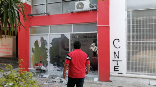 En las fachadas de todos estos edificios dejaron pintas como “Primera Llamada”, “CNTE Vive”, “Abrogación de las reformas estructurales” y otras demandas magisteriales, consignó el diario El Financiero.