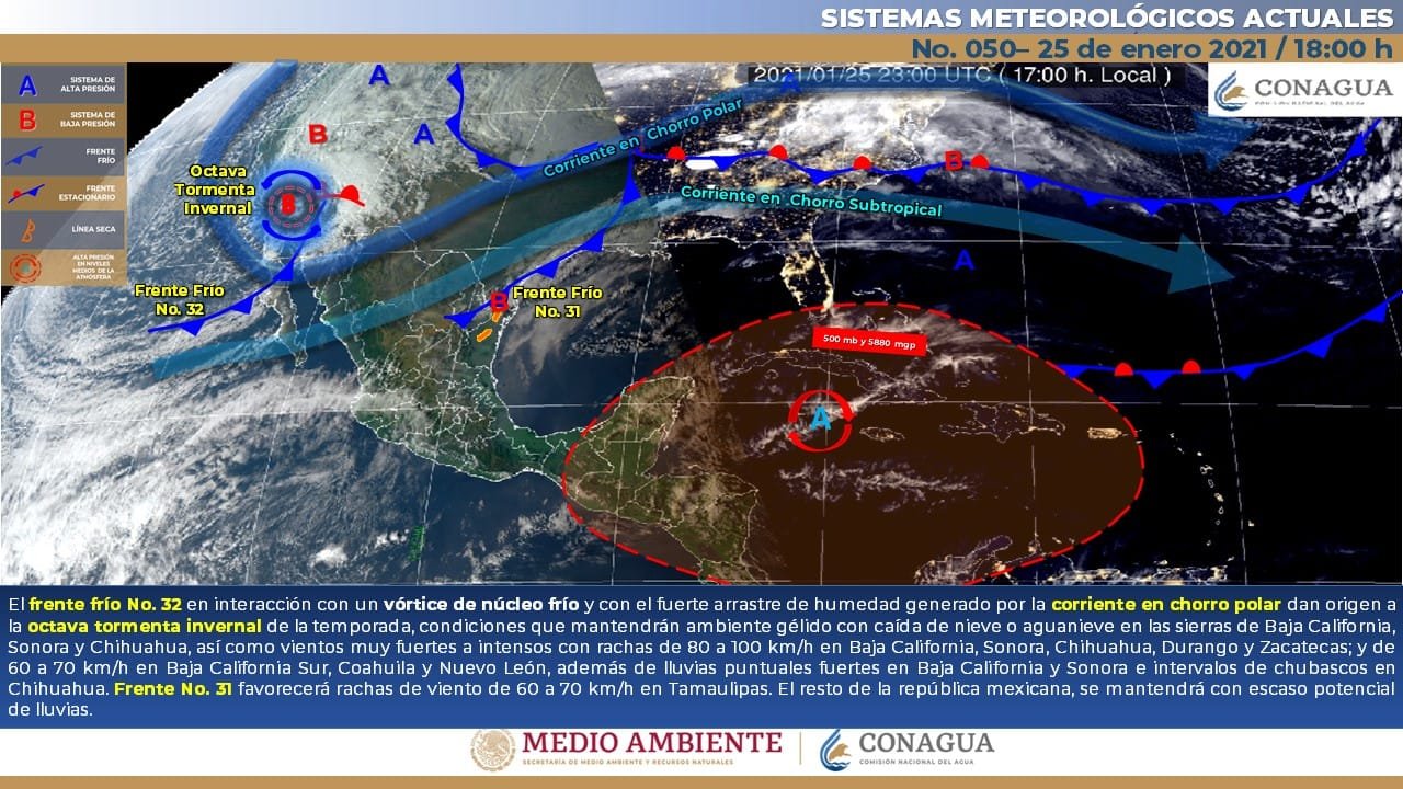 Estas condiciones mantendrán ambiente gélido sobre el noroeste y norte del territorio nacional, vientos fuertes a intensos con tolvaneras en las regiones mencionadas y el noreste del país, así como potencial de lluvias y chubascos en Baja California, Sonora y Chihuahua.