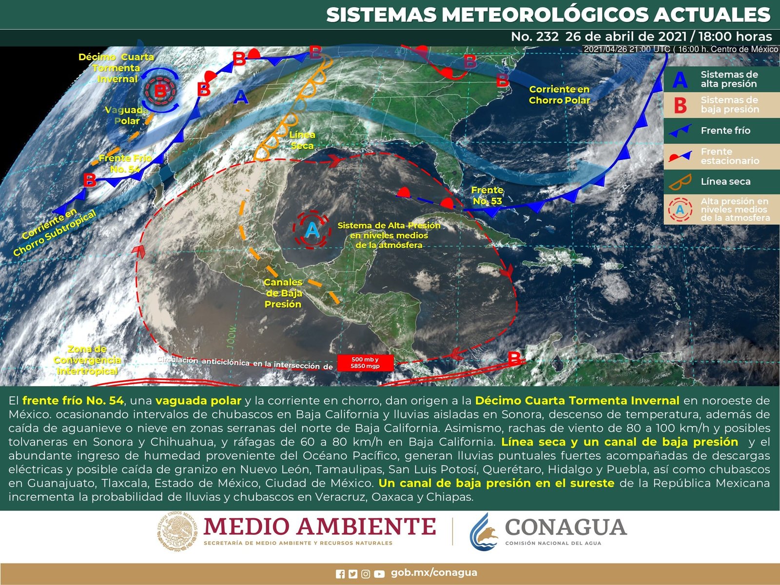 Un canal de baja presión en combinación con la entrada de humedad de ambos litorales y el calentamiento diurno generará lluvias y chubascos vespertinos acompañados de tormentas eléctricas y posibles granizadas sobre entidades del centro, oriente y sureste del territorio nacional.