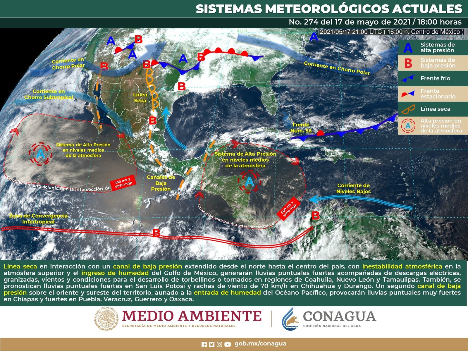 Este fenómeno interaccionará con una línea seca sobre Coahuila y con divergencia en altura sobre el oriente del país ocasionará chubascos y lluvias fuertes acompañadas de descargas eléctricas y posibles granizadas en el norte, noreste, oriente, centro, sur y sureste del país, con lluvias puntuales muy fuertes en Chiapas.