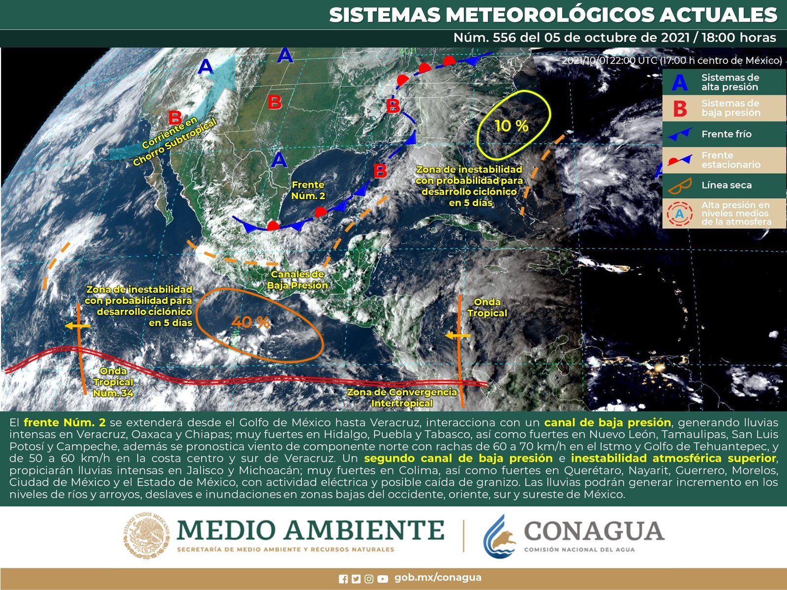 🔊 Escuchar esto Este miércoles, Guanajuato tendrá día con nublados vespertinos y nocturnos, pero con baja probabilidad de lluvia, dio a conocer el Servicio Meteorológico Nacional (SMN). De acuerdo con su último reporte, el organismo dependiente de la Comisión Nacional del Agua (Conagua) pronostica que la Mesa Central del país tendrá cielo nublado por la tarde, con lluvias muy fuertes en Puebla, así como chubascos en Morelos y lluvias aisladas en Guanajuato, Querétaro, Hidalgo y Tlaxcala. Por la mañana continuarán los bancos de niebla y temperaturas frías en zonas serranas, mientras que los vientos del este y noreste 10 a 20 km/h estarán acompañados de rachas de 40 km/h en la región. NOCHE FRESCA EN GUANAJUATO El reporte indica que Guanajuato mantendrá día nublado con apenas 10-20 por ciento de probabilidad de lluvia, aunque se espera frío nocturno. La mayoría de municipios, incluidos los del corredor industrial, tendrán máximas promedio de 24 grados y los nublados permanecerán a lo largo del día. Los municipios del noreste son los que menos probabilidad de lluvia tienen con apenas 5-10 por ciento. Las temperaturas mínimas promedio en el estado serán de 11 grados, aunque las zonas montañosas tendrán 10 grados durante la noche y madrugada del jueves. LLUVIAS EN ZONAS DEL GOLFO Para el resto del país, el SMN dijo que El frente Núm. 2 se mantendrá desde el norte del Golfo de México hasta el sur de Veracruz. Este fenómeno interaccionará con el ingreso de humedad del Océano Pacífico y Golfo de México generando lluvias de fuertes a muy fuertes acompañadas de descargas eléctricas en el oriente y sureste del país, incluida la Península de Yucatán. Se esperan tormentas intensas a puntuales torrenciales que podrán generar incremento en los niveles de ríos y arroyos, deslaves e inundaciones en zonas de Veracruz, Oaxaca, Chiapas y Tabasco, así como viento de componente norte con rachas fuertes en la costa de Veracruz, Istmo y Golfo de Tehuantepec. TORMENTAS EN EL OCCIDENTE Por otra parte, divergencia en altura y el ingreso de humedad del Océano Pacífico, propiciarán chubascos y lluvias puntuales fuertes con actividad eléctrica y posible caída de granizo en el occidente, centro y sur del país. Finalmente, prevalecerá el ambiente vespertino caluroso sobre entidades del noroeste y sur de México, así como en la Península de Yucatán. Los sistemas meteorológicos mencionados ocasionarán este miércoles: Lluvias muy fuertes con puntuales intensas (75 a 150 mm) en Chiapas Oaxaca, Veracruz y Tabasco. Lluvias fuertes con puntuales muy fuertes (50 a 75 mm) en Guerrero y Puebla. Intervalos de chubascos con lluvias puntuales fuertes (25 a 50 mm) en Campeche y Quintana Roo. Intervalos de chubascos (5 a 25 mm) en Durango, Nayarit, Jalisco, Colima, Michoacán, Estado de México, Morelos y Yucatán. Lluvias aisladas (0.1 a 5 mm) en Chihuahua, Sinaloa, Zacatecas, San Luis Potosí, Aguascalientes, Guanajuato, Querétaro, Hidalgo, Tlaxcala y Ciudad de México. Posible caída de granizo en Jalisco, Colima, Michoacán, Guerrero y Estado de México. Viento de componente norte con rachas de 60 a 70 km/h en el Istmo y Golfo de Tehuantepec, y con rachas de 50 a 60 km/h en la costa centro y sur de Veracruz. Viento con rachas de 50 a 60 km/h en Baja California Sur, Coahuila, Nuevo León y Tamaulipas. Temperaturas máximas de 35 a 40 °C en Baja California Sur, Sonora, Sinaloa, Michoacán, Guerrero, Campeche, Yucatán y Quintana Roo. Temperaturas mínimas para la madrugada del jueves de 0 a 5 °C y posibles heladas en zonas montañosas de Chihuahua, Durango, Estado de México, Tlaxcala, Puebla e Hidalgo. Compartir