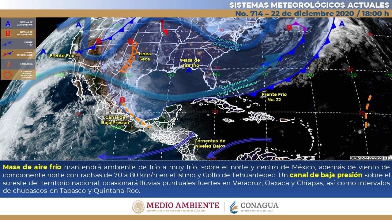 La masa de aire polar que impulsará al frente, en interacción con la corriente en chorro, ocasionará un marcado descenso de temperatura sobre entidades de la Mesa del Norte, así como evento de “Norte” muy fuerte en las costas de Tamaulipas y Veracruz a partir de la madrugada del jueves.
