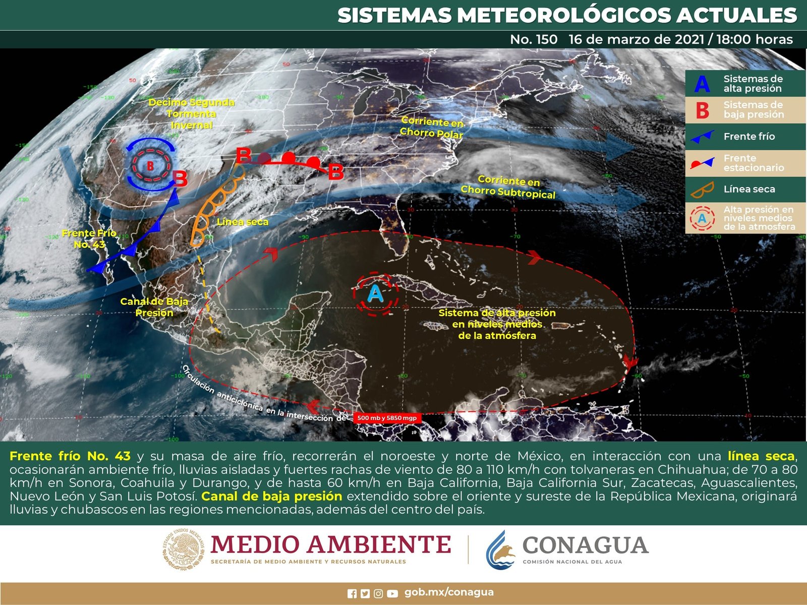 🔊 Escuchar esto Guanajuato mantendrá este miércoles altas temperaturas con máximas promedio de 31 grados, dio a conocer el Servicio Meteorológico Nacional (SMN). De acuerdo con su último reporte, el organismo dependiente de la Comisión Nacional del Agua (Conagua) prevé que la Mesa Central del país tendrá cielo despejado por la mañana y nublado por la tarde, con intervalos de chubascos solo en los estados de Hidalgo y Puebla, así como lluvias aisladas en Querétaro y Tlaxcala. Continúa el ambiente frío al amanecer y cálido a caluroso durante el día, mientras que el viento tendrá rachas hasta de 50 km/h. CALORÓN EN GUANAJUATO Guanajuato, según el reporte, seguirá con elevadas temperaturas en todos sus municipios promediando los 31 y 32 grados con nula probabilidad de lluvia. Los municipios de León, Guanajuato capital, Silao, Irapuato, Salamanca, Celaya, Comonfort, Dolores Hidalgo y Pénjamo tendrán cielos despejados con máximas de 31 y viento fresco vespertino. Las mínimas en estos municipios serán de 8 a 10 grados, añadió el reporte. Los municipios del noreste tendrán mínimas de 7 y 8 grados. LLUVIAS EN EL NORTE Y NORESTE Para el resto del país, el SMN dijo que el frente No. 43 y su masa de aire frío asociada recorrerá el norte y noreste del territorio nacional. Este fenómeno interaccionará con un canal de baja presión que se extenderá sobre el oriente y sureste de México, ocasionando lluvias y chubascos en las regiones mencionadas. Se esperan tormentas puntuales fuertes en Chiapas, así como evento de “Norte” en las costas de Tamaulipas y Veracruz. CALOR EN LA MAYOR PARTE DEL PAÍS Asimismo, la circulación anticiclónica en niveles medios de la atmósfera mantendrá onda de calor sobre entidades del occidente, sur y sureste del país, además de ambiente caluroso a muy caluroso en el oriente y centro del país. Los sistemas meteorológicos ocasionarán este miércoles: Intervalos de chubascos (5.1 a 25.0 mm) en los estados de Chiapas, Hidalgo, Puebla, Veracruz y Oaxaca. Lluvias aisladas (0.1 a 5.0 mm) en San Luis Potosí, Querétaro, Tlaxcala, Estado de México y Ciudad de México. Viento de componente sur con rachas de 70 a 80 km/h en Veracruz (sur), Istmo y Golfo de Tehuantepec. Evento de “Norte” con rachas de 60 a 70 km/h durante la noche en costas de Tamaulipas y Veracruz. Viento con rachas de 60 a 70 km/h con tolvaneras en Coahuila y Nuevo León. Viento con rachas de 50 a 60 km/h en el golfo de California, San Luis Potosí, Hidalgo y costas de: Sonora, Sinaloa, Yucatán y Quintana Roo. Oleaje de 1 a 2 metros de altura significante en las costas de Tamaulipas y Veracruz (norte). Temperaturas máximas de 40 a 45 °C en Michoacán, Guerrero, Veracruz (sur) y Oaxaca (norte). Temperaturas máximas de 35 a 40 °C en Tamaulipas, San Luis Potosí, Hidalgo, Querétaro, Guanajuato, Sinaloa, Nayarit, Jalisco, Colima, Estado de México (suroeste), Morelos, Puebla (suroeste), Chiapas, Tabasco, Campeche, Yucatán y Quintana Roo. Temperaturas mínimas para la madrugada del jueves de -5 a 0 °C con heladas en las zonas montañosas de Sonora, Chihuahua, Durango y Zacatecas. Temperaturas mínimas para la madrugada del jueves de 0 a 5 °C y posibles heladas en zonas montañosas de Baja California, Coahuila, Nuevo León, San Luis Potosí, Aguascalientes, Jalisco (noreste), Guanajuato, Estado de México, Hidalgo, Puebla y Tlaxcala. Compartir