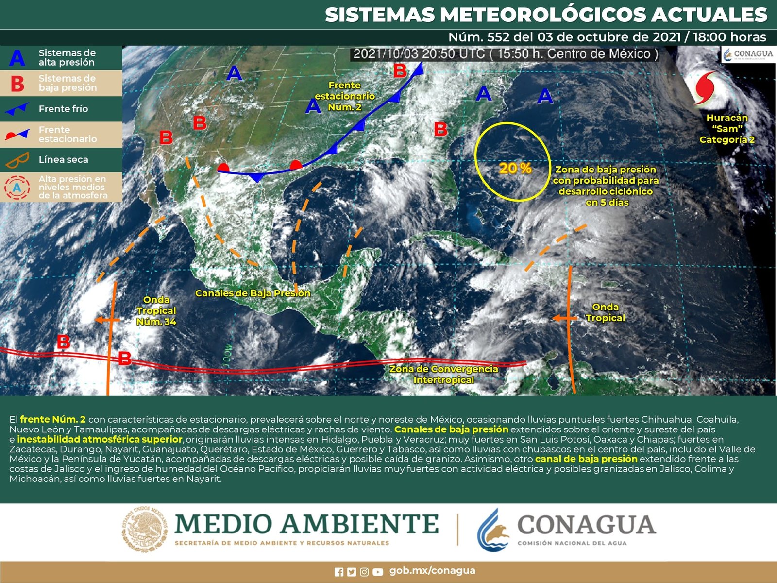 🔊 Escuchar esto Este lunes, Guanajuato mantendrá baja la probabilidad de lluvia, aunque habrá nublados vespertinos, dio a conocer el Servicio Meteorológico Nacional (SMN). De acuerdo con su último reporte, el organismo dependiente de la Comisión Nacional del Agua (Conagua) prevé que la Mesa Central del país tendrá cielo nublado la mayor parte del día con lluvias muy fuertes en Querétaro, Hidalgo y Puebla, así como intervalos de chubascos en Guanajuato, Tlaxcala y Morelos. Las zonas montañosas de la región mantendrán bancos de niebla y temperaturas frías, mientras que los vientos del este y noreste 10 a 20 km/h estarán acompañados de rachas de 40 km/h en zonas de tormenta. NUBLADOS EN GUANAJUATO El reporte indica que Guanajuato mantendrá entre 20-30 la probabilidad de lluvia, aunque algunas regiones podrán tener intervalos de chubascos nocturnos. Este será el caso de los municipios fronterizos con Michoacán y los del sur-suroeste, mientras que los del corredor industrial registrarán nublados vespertinos y probables lloviznas durante la noche. Las temperaturas máximas promedio en el estado serán de 24 grados con algunas rachas de viento, mientras que las mínimas llegarán a 12 y 13 grados en la noche y madrugada del martes. LLUVIAS FUERTES EN EL SUR Para el resto del país, el SMN reporta que el frente núm. 2 se extenderá desde el noreste del Golfo de México hasta el norte de Veracruz. Este fenómeno interaccionará con un canal de baja presión extendido sobre el sureste del territorio nacional generando lluvias de fuertes a muy fuertes acompañadas de descargas eléctricas y posibles granizadas en el noreste, oriente y sureste del país. Se pronostican tormentas puntuales intensas que podrán generar incremento en los niveles de ríos y arroyos, deslaves e inundaciones en zonas de Veracruz, Oaxaca y Chiapas, así como viento de componente norte con rachas de 60 a 70 km/h en el Istmo y Golfo de Tehuantepec, y con rachas de 50 a 60 km/h en Chihuahua y Coahuila. INGRESA HUMEDAD EN EL PACÍFICO Por otra parte, divergencia en altura y el ingreso de humedad del Océano Pacífico, propiciarán chubascos y lluvias puntuales fuertes con actividad eléctrica y posible caída de granizo en el occidente, centro y sur de México. Finalmente, prevalecerá el ambiente vespertino caluroso sobre entidades del noroeste de la República Mexicana, así como en la Península de Yucatán. Los sistemas meteorológicos mencionados ocasionarán este lunes: Lluvias muy fuertes con puntuales intensas (75 a 150 mm) en los estados de Veracruz, Oaxaca y Chiapas. Lluvias fuertes con puntuales muy fuertes (50 a 75 mm) en San Luis Potosí, Querétaro, Hidalgo, Puebla y Tabasco. Intervalos de chubascos con lluvias puntuales fuertes (25 a 50 mm) en Chihuahua, Nuevo León, Tamaulipas, Zacatecas, Durango, Jalisco, Michoacán, Guerrero, Estado de México y Campeche. Intervalos de chubascos (5 a 25 mm) en Sinaloa, Nayarit, Colima, Coahuila, Aguascalientes, Guanajuato, Tlaxcala, Ciudad de México, Morelos, Yucatán y Quintana Roo. Lluvias aisladas (0.1 a 5 mm) en Baja California Sur, Baja California y Sonora. Posible caída de granizo en Coahuila, Nuevo León, Tamaulipas, San Luis Potosí, Zacatecas, Durango, Aguascalientes, Jalisco, Michoacán, Estado de México, Puebla, Veracruz y Oaxaca. Viento de componente norte con rachas de 60 a 70 km/h en el Istmo y Golfo de Tehuantepec. Viento con rachas de 50 a 60 km/h en Chihuahua y Coahuila. Temperaturas máximas de 35 a 40 °C en Baja California Sur, Sonora, Sinaloa, Campeche, Yucatán y Quintana Roo. Temperaturas mínimas para la madrugada del martes de 0 a 5 °C y posibles heladas en zonas montañosas de Chihuahua, Durango, Estado de México, Tlaxcala, Puebla e Hidalgo. Compartir
