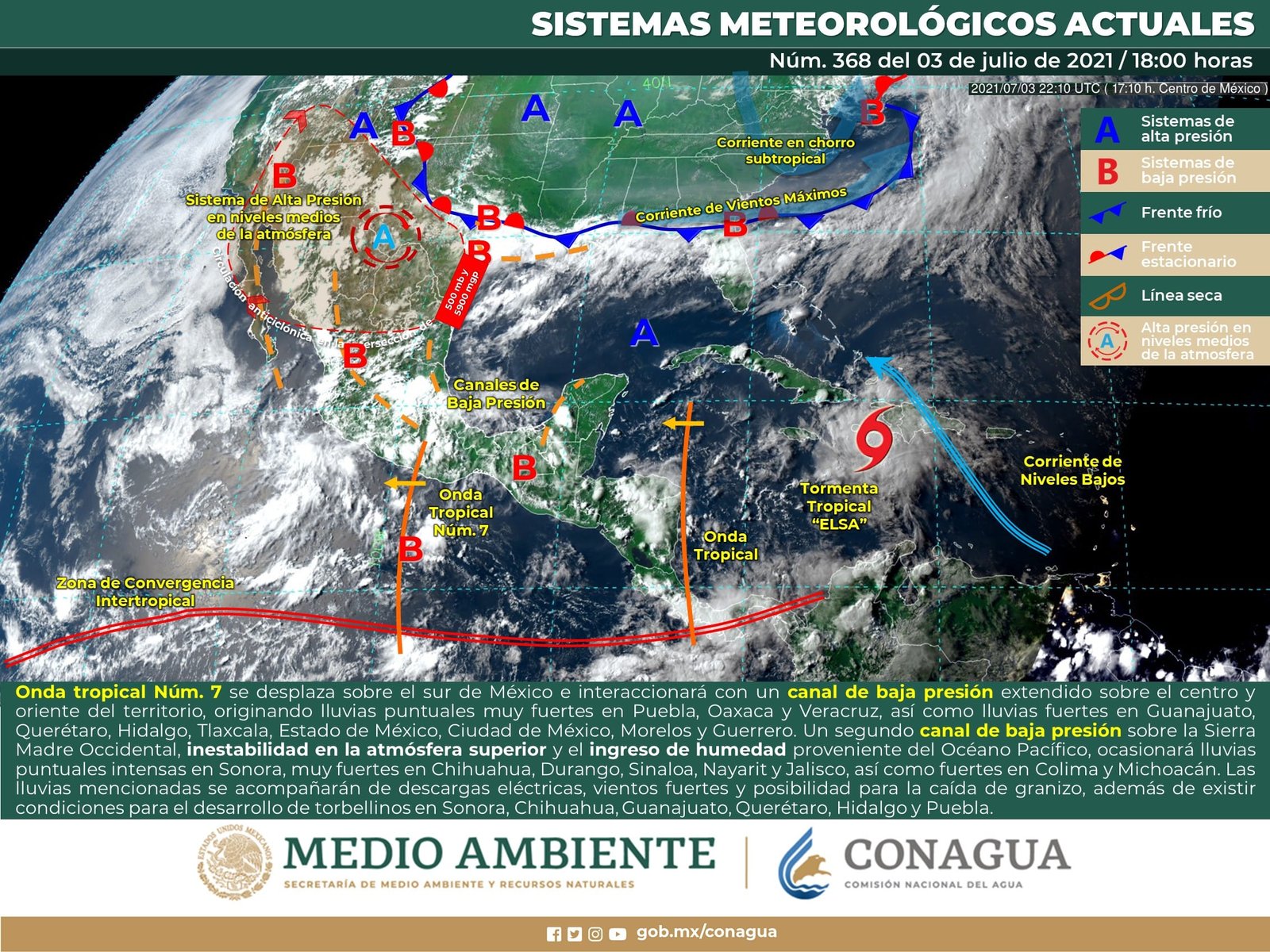 🔊 Escuchar esto Guanajuato se verá afectado este domingo por la onda tropical 7 con intervalos de chubascos en algunas zonas, aunque también estará soleado durante el día, dio a conocer el Servicio Meteorológico Nacional (SMN). De acuerdo con su último reporte, el organismo dependiente de la Comisión Nacional del Agua (Conagua) pronostica que la Mesa Central del país registrará lluvias puntuales intensas en los estados de Hidalgo y Puebla, muy fuertes en Querétaro y Tlaxcala, así como chubascos en Guanajuato, Hidalgo y Morelos. Existen condiciones para el desarrollo de torbellinos en Puebla y en los límites entre el Estado de México e Hidalgo. Bancos de niebla en zonas serranas de la región y se esperan rachas de hasta 50 km/h en zonas de tormenta. VUELVEN SOLEADOS EN PARTES DE GUANAJUATO El reporte indica que Guanajuato se verá afectado por la onda tropical 7 con zonas que registrarán intervalos de chubascos. Los municipios que tienen más probabilidad de lluvia son Irapuato, Salamanca, San Miguel de Allende y San Luis de la Paz. Todos tendrán máximas de 24 grados con mínimas de 14, dijo el reporte. León, Guanajuato capital, Celaya, Pénjamo, Dolores Hidalgo, Comonfort y Salvatierra tienen 40 por ciento de probabilidad de chubascos vespertinos con temperaturas máximas de 26 y mínimas de 14. HUMEDAD EN EL PACÍFICO Y GOLFO Para el resto del país, el SMN dijo que canales de baja presión, en interacción con divergencia en altura y el ingreso de humedad del Océano Pacífico y Golfo de México, continuarán generando chubascos y lluvias fuertes a muy fuertes, descargas eléctricas y posible caída de granizo sobre entidades del noroeste, norte, noreste y oriente del país. La onda tropical Núm. 7 recorrerá el sur y occidente del territorio nacional, en interacción con divergencia en altura ocasionará chubascos y lluvias fuertes acompañadas de descargas eléctricas y posibles granizadas sobre las regiones mencionadas además del centro del país. ALERTA DE NUEVA ONDA TROPICAL Nueva onda tropical ingresará y recorrerá la Península de Yucatán, ocasionando chubascos y lluvias fuertes acompañadas de descargas eléctricas y posibles granizadas en dicha Península y el sureste mexicano, con lluvias puntuales intensas en Chiapas. Prevalecerá ambiente caluroso a muy caluroso con temperaturas superiores a 40°C en zonas de Baja California y Sonora. Los sistemas meteorológicos ocasionarán este domingo: Lluvias fuertes con lluvias puntuales muy fuertes (50.1 a 75.0 mm) en Chiapas y Nayarit. Intervalos de chubascos con lluvias puntuales fuertes (25.1 a 50.0 mm) en Sonora, Chihuahua, Sinaloa, Durango, Zacatecas, Jalisco, Guerrero, Hidalgo, Ciudad de México, Estado de México, Morelos, Tlaxcala, Puebla, Veracruz y Oaxaca. Intervalos de chubascos (5.1 a 25.0 mm) en Coahuila, Nuevo León, Tamaulipas, San Luis Potosí, Aguascalientes, Colima, Michoacán, Guanajuato, Querétaro, Tabasco, Campeche, Yucatán y Quintana Roo. Posible caída de granizo en Sonora, Chihuahua, Durango, Jalisco, Michoacán, Guanajuato, Querétaro, Hidalgo, Estado de México, Ciudad de México, Morelos, Tlaxcala, Puebla, Veracruz y Oaxaca. Posibilidad de tormentas eléctricas en Sonora, Chihuahua, Coahuila, Nuevo León, Tamaulipas, San Luis Potosí, Aguascalientes, Zacatecas, Durango, Sinaloa, Nayarit, Jalisco, Colima, Michoacán, Guanajuato, Querétaro, Hidalgo, Veracruz, Puebla, Tlaxcala, Estado de México, Ciudad de México, Morelos, Guerrero, Oaxaca, Chiapas, Campeche, Yucatán y Quintana Roo. Viento con rachas de 50 a 60 km/h en Chihuahua, Coahuila, Nuevo León, Tamaulipas, Campeche y Yucatán. Temperaturas máximas de 40 a 45 °C en Baja California y Sonora. Temperaturas máximas de 35 a 40 °C en Baja California Sur, Chihuahua, Coahuila, Nuevo León, Tamaulipas, Campeche y Yucatán. Temperaturas mínimas para la madrugada del lunes de 0 a 5 °C y posibles heladas en zonas montañosas del Estado de México. Compartir