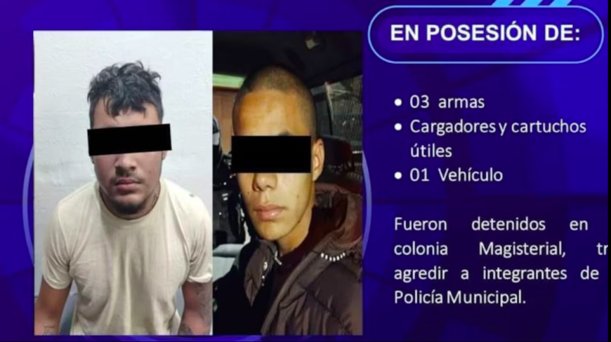 En este lugar, la Policía Municipal detuvo a dos personas, a quienes les aseguraron tres armas, cargadores y cartuchos útiles, así como un vehículo.