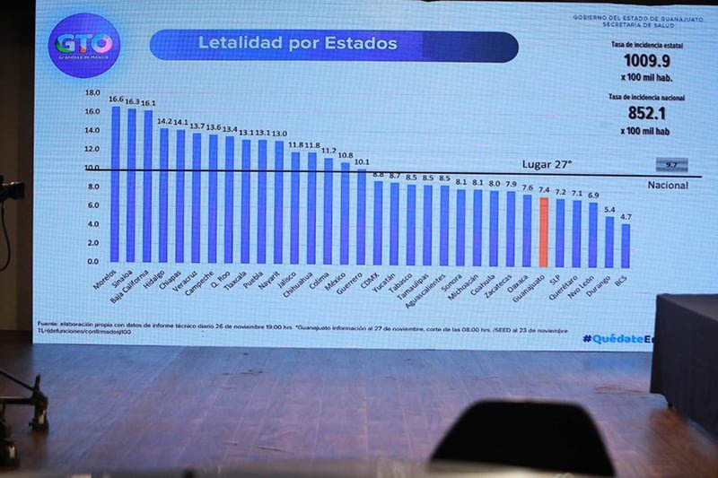 🔊 Escuchar esto Guanajuato se quedó a nada de regresar al Semáforo Rojo. En cambio, la Secretaría de Salud del estado (SSG) dijo que, ante el aumento de contagios y muertes por el Covid-19 en las últimas semanas en Guanajuato, el Semáforo Estatal para la Reactivación pasó a “Naranja con Alerta”. Esta medida aplicará del 30 de noviembre al 6 de diciembre y contempla la aplicación de más restricciones a las actividades económicas en el estado. El titular de la SSG, Daniel Alberto Díaz Martínez, hizo un llamado a la conciencia social de los guanajuatenses a fin de que se refuercen las medidas preventivas, ya que el estado está en riesgo de pasar a Semáforo “Rojo”. “La posibilidad de pasar a Semáforo Rojo es muy alto, y necesitamos trabajar todos, tenemos que hacer un esfuerzo extraordinario para evitar más contagios y muertes por Covid-19”, puntualizó. En el reporte del 23 al 29 de noviembre, Guanajuato registra 62 mil 346 casos confirmados, en investigación 4 mil 906, descartados 81 mil 873, defunciones 4 mil 080, recuperados 52 mil 316 y de transmisión comunitaria 62 mil 190. VIENEN MÁS RESTRICCIONES El estado, en coordinación con los 46 municipios, aplicará medidas adicionales con el Semáforo “Naranja con Alerta”. El objetivo es que todas las actividades económicas permanezcan abiertas y sin restricciones de horarios. A CUMPLIR LAS MEDIDAS Las actividades económicas se mantienen con el porcentaje actual del 50 por ciento de capacidad instalada y/o aforo, el reforzamiento de filtros sanitarios en todos los puntos de acceso a cualquier actividad, movilidad solo la necesaria para actividades económicas y evitar aglomeraciones. En eventos sociales abra reducción de aforo con máximo de 75 asistentes en lugares cerrados, ventilados y con sana distancia, y máximo de 100 asistentes en lugares abiertos con sana distancia. Para eventos empresariales máximo 100 asistentes en lugares cerrados, ventilados y con sana distancia, y máximo 200 asistentes en lugares abiertos con sana distancia. En eventos de culto máximo 30 por ciento de su capacidad instalada, no fiestas patronales, no peregrinaciones, no actividades en atrios y no actividades masivas. Para casinos, bares y cantinas, máximo 30 por ciento de su capacidad instalada. En espacios públicos como alamedas, jardines, parques, balnearios, entre otros, deberán tener una capacidad instalada del 20 por ciento; estéticas, salones de belleza y peluquerías con aforo previa cita, sin áreas de espera. En clubes, centros deportivos, gimnasios, spa y piscinas con aforo previo cita, con un máximo de aforo registrado en el protocolo de seguridad sanitaria sin rebasar el 20 por ciento. El secretario de Salud reiteró a la ciudadanía que se debe cumplir con las medidas sanitarias como el uso continuo de cubrebocas en todo lugar, respetar las disposiciones del Semáforo para la Reactivación, reforzar la prevención dentro de los hogares, evitar reuniones familiares y sociales sin importar el número de personas, aplicación de la vacuna contra la Influenza especialmente en los grupos vulnerables y procurar tener un oxímetro a la mano para medición continua en el hogar. LOS NÚMEROS DE ALERTA Guanajuato registra un 40 por ciento en ocupación hospitalaria de camas reconvertidas La tasa de positividad se encuentra en un 50 por ciento La tasa de letalidad es del 7.4 por debajo de la media nacional que es del 9.7 y El sector salud ha procesado 175 mil 832 muestras. Las ocupaciones con mayor incidencia en casos confirmados de Covid-19 son en empleados, hogar y estudiantes. Compartir