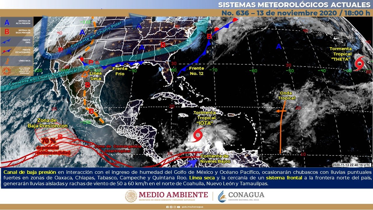Para el resto del país, el SMN prevé un canal de baja presión sobre el norte de la República Mexicana, en interacción con la proximidad de un nuevo frente frío, originará lluvias aisladas y vientos fuertes con rachas de 40 a 50 km/h sobre Coahuila, Nuevo León y Tamaulipas.