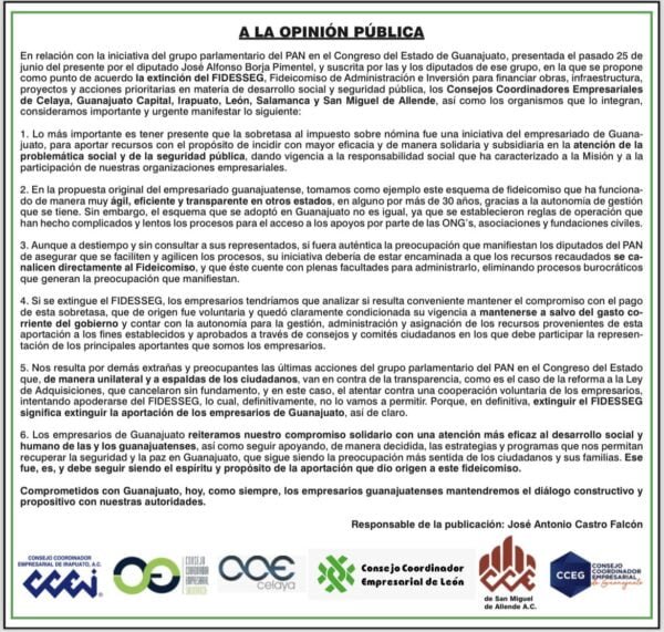 Encontronazo a la vista. Luego de que la bancada del PAN en el Congreso de Guanajuato anunció que desaparecerá el Fideicomiso de Administración e Inversión para financiar obras, infraestructura, proyectos y acciones prioritarias en materia de desarrollo social y seguridad para Guanajuato (Fidesseg), la iniciativa privada expresó su enérgica protesta. Desde la mañana del miércoles trascendió que los diputados del PAN presentarán este jueves una iniciativa para desaparecer el fideicomiso mediante un exhorto a la Secretaría de Finanzas. El Fidesseg fue creado en abril del 2019 con el objetivo de impulsar obras sociales y fortalecer la seguridad. Este fideicomiso se financia con el 0.3 por ciento del Impuesto sobre Nóminas, y el dinero se entrega a organizaciones no gubernamentales que realizan labores sociales, después de que son sometidos a un comité de evaluación para su aprobación. Aunque no se presentó un argumento sólido que justifique la desaparición, será este jueves cuando se conozcan los argumentos. RECLAMO EMPRESARIAL Sin embargo, el Consejo Coordinador Empresarial (CCE) emitió un comunicado en el que condenó enérgicamente la decisión unilateral “que menosprecia el compromiso del empresariado con el desarrollo social y la seguridad de los guanajuatenses”. En su reclamo, los empresarios de los municipios de León, Celaya, Guanajuato capital, Irapuato, Salamanca y San Miguel de Allende agrupados en el CCE señalan que este fideicomiso ha funcionado de manera eficiente, ágil y transparente en otros estados. No obstante, indicaron que las reglas de operación establecidas en Guanajuato “han hecho complicados y lentos los procesos para el acceso a los apoyos por parte de las ONG’s, asociaciones y fundaciones civiles”. “Aunque a destiempo y sin consultar a sus representados, si fuera auténtica la preocupación que manifiestan los diputados del PAN de asegurar que se faciliten y agilicen los procesos, su iniciativa debería estar encaminada a que los recursos recaudados se canalicen directamente el Fideicomiso”, indican. Destacan que este Fideicomiso debe contar con “plenas facultades para administrarlo, eliminando procesos burocráticos que generan la preocupación que manifiestan”. QUITARÍAN APORTACIONES De hecho, advierten que, si se elimina el Fidesseg, retirarían las aportaciones, toda vez que fueron voluntarias y condicionadas a que estuvieran marginadas del gasto corriente del gobierno estatal. “Extinguir el Fidesseg significa extinguir la aportación de los empresarios de Guanajuato, así de claro”, remató el comunicado del CCE. Compartir Navegación de entradas Presa de la Olla está al tope y queda en vigilancia permanente Detención del hijo del Marro redujo la inseguridad