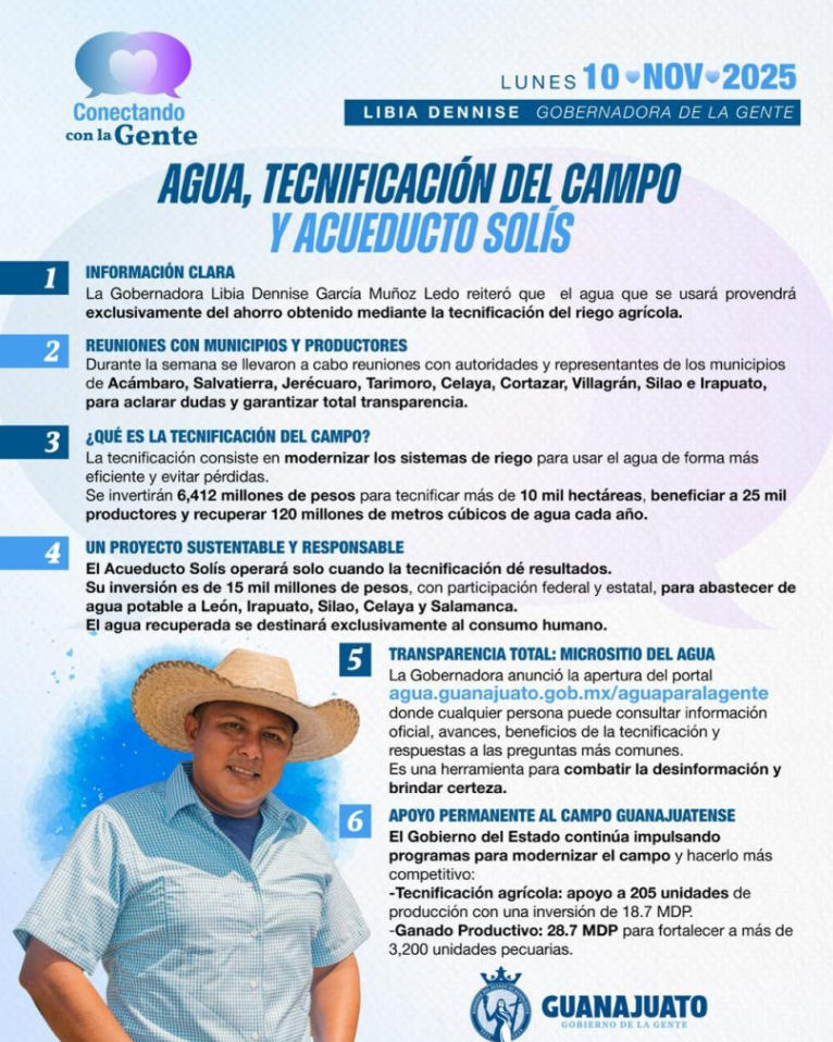 (Fotografía:Especial) Redacción: Victoria Dueñas Ante la creciente suspicacia y las recientes movilizaciones de sectores agrícolas, la gobernadora de Guanajuato, Libia Dennise García Muñoz Ledo, aseguró que el proyecto para conducir agua de la Presa Solís hacia León y el corredor industrial sigue firme. El reciente retiro de maquinaria de la zona, explicó, no obedece a una cancelación, sino al cumplimiento de etapas contractuales tras concluir el revestimiento del Canal de Coria. El factor de la discordia: ¿Por qué se fue la maquinaria? El movimiento de equipo pesado en días pasados encendió las alarmas entre productores de la región, quienes interpretaron el hecho como una posible victoria en sus protestas o la cancelación de la obra. Sin embargo, la mandataria precisó: “Estas maquinarias se retiran porque cumplen los contratos para los cuales están asignadas en ese momento, no significa que concluya la actividad en el tema del acueducto”, puntualizó García Muñoz Ledo. La Gobernadora detalló que el equipo finalizó las labores de encementado del canal y que el siguiente paso es la tecnificación de parcelas, un proceso que busca modernizar el riego en la región. Diálogo por la Presa Solís A pesar del optimismo gubernamental, grupos de agricultores en Acámbaro y municipios aledaños mantienen su postura de rechazo, argumentando que el acueducto compromete el agua necesaria para la producción agrícola. Al respecto, el Gobierno Estatal sostiene que la resistencia responde, en algunos casos, a consignas políticas. Para mitigar el conflicto, se han realizado: 40 reuniones con sectores ciudadanos. Acercamiento con más de 1,500 personas, incluyendo líderes religiosos y delegados de comunidades en Acámbaro y Jerécuaro. Entrega de información detallada a la Presidenta de México, Claudia Sheinbaum, para asegurar el respaldo federal. El proyecto en cifras: ¿A quién beneficia? Por su parte, el secretario del Agua y Medio Ambiente, José Lara Lona, enfatizó que el proyecto es una estrategia de “ganar-ganar”. El objetivo no es “quitar” agua, sino recuperar la que se desperdicia por falta de infraestructura moderna. ConceptoDetalleInversión Global$6,500 millones de pesos ($5,000 fed. / $1,500 est.)Beneficiarios2.4 millones de guanajuatenses y 25 mil productores.Meta de Tecnificación240 kilómetros de canales (15 km ya concluidos).Extracción MáximaHasta 120 millones de metros cúbicos anuales. Tecnificación: El eje de la propuesta Lara Lona explicó que la tecnificación parcelaria será voluntaria. Cada productor decidirá si desea implementar sistemas de riego por goteo, aspersión o nivelación de tierras. “Este proyecto no le quita el agua a nadie”, recalcó, señalando que la clave está en el revestimiento de canales para evitar filtraciones y optimizar el uso del vital líquido antes de enviarlo a las zonas urbanas. Compartir Navegación de entradas Avanzan obras hidráulicas en Romita Beca Transporte León 2026: Todo lo que necesitas saber para obtener el apoyo