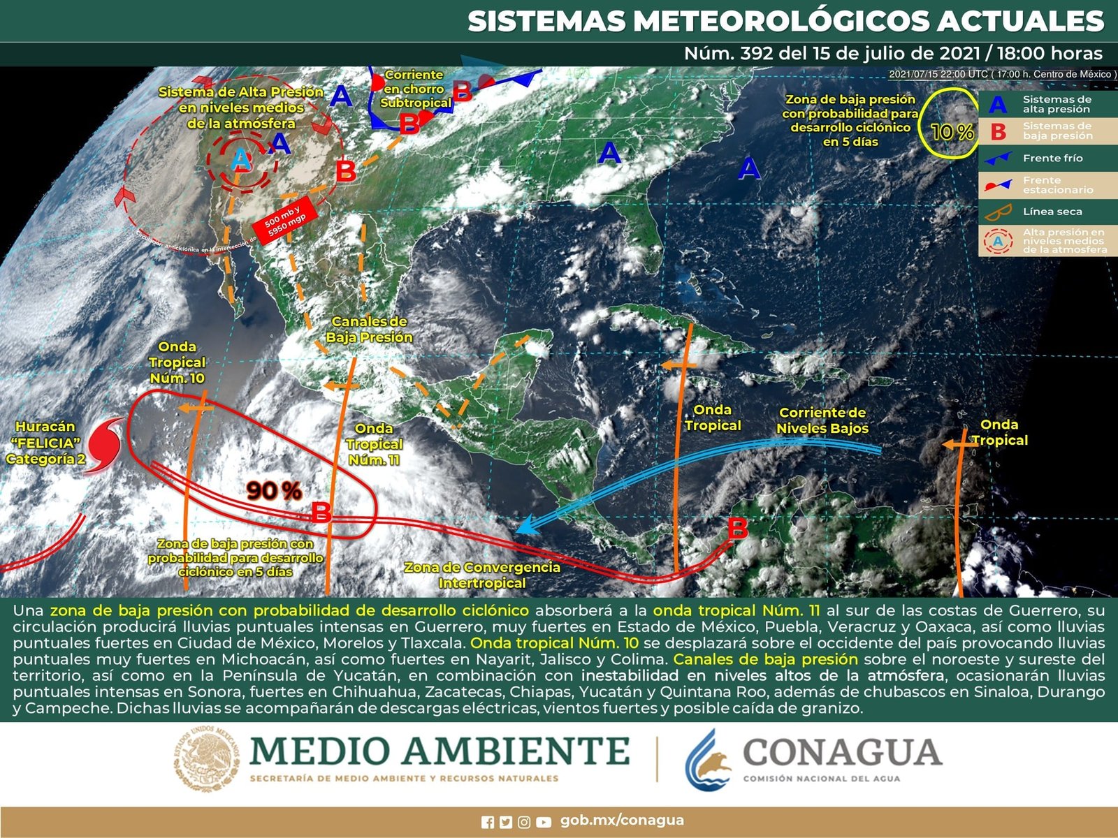 🔊 Escuchar esto Este viernes, Guanajuato tendrá temperaturas máximas de 23 grados con algunos nublados y probabilidad alta de lluvias nocturnas, dio a conocer el Servicio Meteorológico Nacional (SMN). De acuerdo con su último reporte, el organismo dependiente de la Conagua pronostica que la Mesa Central del país tendrá cielo parcialmente nublado por la mañana y nublado hacia la tarde con lluvias puntuales muy fuertes en Guanajuato, fuertes en Querétaro e intervalos de chubascos en Hidalgo, Puebla, Morelos y Tlaxcala, todas con descargas eléctricas y posibles granizadas en Guanajuato, Querétaro. Se esperan bancos de niebla en zonas serranas de la región, mientras que el viento de dirección variable de 10 a 25 km/h tendrá rachas de hasta 50 km/h en zonas de tormenta. GUANAJUATO NUBLADO El reporte indica que Guanajuato regresará con nublados desde la mañana y en la tarde y noche con temperaturas máximas de 23 grados. Se espera que en la mayoría de los municipios del estado se presenten lluvias nocturnas acompañadas de viento. Según el reporte, los chubascos se registrarían en el transcurso de la noche. Las temperaturas máximas promedio en todo el estado serán de 22 a 23 grados, mientras que las mínimas promediarán entre los 13 y 14 grados. PROBABLE HURACÁN DESDE JALISCO Y COLIMA Para el resto del país, el SMN dijo que para este día, una zona de baja de baja presión con probabilidad para desarrollo ciclónico se localizará al sur de las costas de Jalisco y Colima. Por su parte, un canal de baja presión se mantendrá a lo largo de la Sierra Madre Occidental que, en interacción con divergencia en niveles altos de la atmósfera y el ingreso de humedad del Océano Pacífico, originarán chubascos, lluvias fuertes a puntuales muy fuertes acompañadas de descargas eléctricas en el noroeste, norte, centro, occidente y sur del país. CHUBASCOS EN EL SUR Asimismo, un canal de baja presión se extenderá sobre la Península de Yucatán, aunado al paso de una nueva onda tropical, producirán intervalos de chubascos y lluvias puntuales fuertes en dicha península, además del sureste del país. CALUROSO EN EL NORTE Finalmente, prevalecerá ambiente caluroso a muy caluroso sobre entidades del noroeste, occidente, norte y noreste del país, así como en la Península de Yucatán, con temperaturas máximas de 40 a 45 °C en zonas de Baja California y Sonora. Los sistemas meteorológicos ocasionarán este viernes: Lluvias fuertes con lluvias puntuales muy fuertes (50.1 a 75.0 mm) en los estados de Sonora, Chihuahua, Guanajuato y Jalisco. Intervalos de chubascos con lluvias puntuales fuertes (25.1 a 50.0 mm) en Coahuila, Zacatecas Aguascalientes, Durango, Sinaloa, Nayarit, Colima, Michoacán, Estado de México, Querétaro, Guerrero, Oaxaca, Chiapas y Campeche. Intervalos de chubascos (5.1 a 25.0 mm) en Nuevo León, Tamaulipas, San Luis Potosí, Hidalgo, Ciudad de México, Veracruz, Puebla, Morelos, Tlaxcala, Tabasco, Yucatán y Quintana Roo. Posibilidad de tormentas eléctricas en Sonora, Chihuahua, Coahuila, Nuevo León, San Luis Potosí, Aguascalientes, Zacatecas, Durango, Sinaloa, Nayarit, Jalisco, Colima, Michoacán, Guanajuato, Querétaro, Hidalgo, Estado de México, Ciudad de México, Morelos, Tlaxcala, Puebla, Guerrero, Veracruz, Oaxaca, Chiapas, Campeche, Yucatán y Quintana Roo. Viento con rachas de 50 a 60 km/h en Chihuahua, Coahuila, Nuevo León, Tamaulipas, San Luis Potosí, Zacatecas, Durango, Istmo y Golfo de Tehuantepec, y costas de: Jalisco, Colima, Michoacán y Guerrero. Temperaturas máximas de 40 a 45 °C en Baja California y Sonora. Temperaturas máximas de 35 a 40 °C en Baja California Sur, Sinaloa, Chihuahua, Coahuila, Nuevo León, Tamaulipas, Tabasco, Campeche, Yucatán y Quintana Roo. Temperaturas mínimas para la madrugada del sábado de 0 a 5 °C y posibles heladas en las zonas montañosas de Chihuahua, Durango, Estado de México, Hidalgo, Tlaxcala y Puebla. Compartir