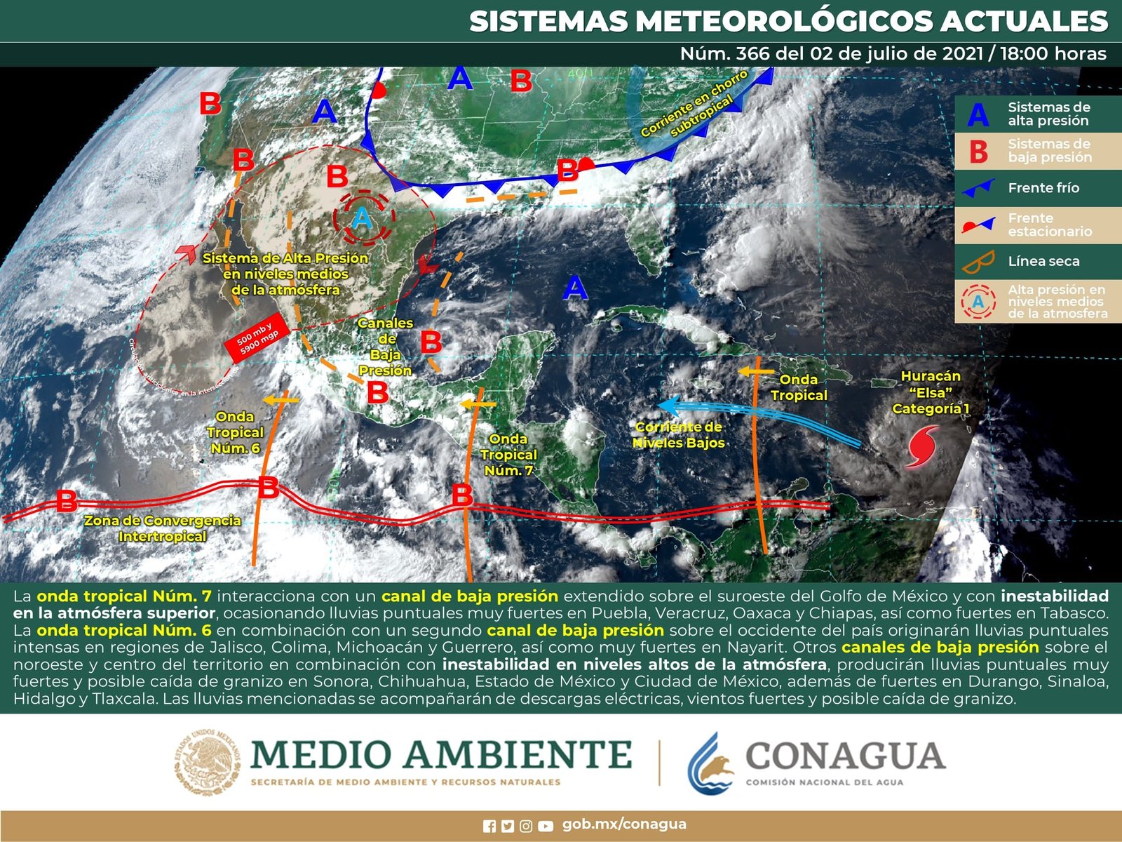 🔊 Escuchar esto Guanajuato seguirá este sábado con nublados vespertinos y varias zonas registrarán tormentas dispersas, dio a conocer el Servicio Meteorológico Nacional (SMN). De acuerdo con su último reporte, el organismo dependiente de la Comisión Nacional del Agua (Conagua) prevé que la Mesa Central del país registrará lluvias puntuales muy fuertes en Puebla y fuertes en Guanajuato, Querétaro, Hidalgo, Tlaxcala y Morelos, todas acompañadas de descargas eléctricas y posible caída de granizo. Se esperan bancos de niebla en zonas serranas de la región, mientras el viento de dirección variable de 10 a 25 km/h tendrá rachas de hasta 45 km/h en zonas de tormenta. ALTA HUMEDAD EN GUANAJUATO El reporte indica que Guanajuato tendrá humedad hasta de 75 por ciento a lo largo del día con nublados y tormentas dispersas. Las zonas del noreste del estado serán las que tengan probabilidad más alta de tormentas vespertinas hasta con 70 por ciento. El resto de las demarcaciones del estado tienen de 45 a 50 por ciento de posibilidad de lluvia con temperaturas máximas de 25 grados y mínimas de 15. PEGA ONDA TROPICAL EN SUR Y CENTRO Para el resto del país, el SMN dijo que la onda tropical Núm. 7 recorrerá el sureste y sur del país, interaccionará con divergencia en altura, ocasionando chubascos y lluvias fuertes a muy fuertes acompañadas de descargas eléctricas y posibles granizadas sobre entidades del centro, oriente, sur y sureste del país. CANAL DE BAJA PRESIÓN EN EL NORTE Por otra parte, un canal de baja presión sobre la Mesa del Norte, en combinación con divergencia en altura y con el ingreso de humedad del Océano Pacífico y Golfo de México, originarán chubascos y lluvias fuertes a muy fuertes, descargas eléctricas y posible caída de granizo en el noroeste, norte, noreste y occidente de la República Mexicana, con lluvias puntuales intensas en Sinaloa y Nayarit. Los sistemas meteorológicos ocasionarán este sábado: Lluvias muy fuertes con lluvias puntuales intensas (75.1 a 150.0 mm) en los estados de Sinaloa y Nayarit. Lluvias fuertes con lluvias puntuales muy fuertes (50.1 a 75.0 mm) en Sonora, Chihuahua, Durango, Jalisco, Colima y Michoacán. Intervalos de chubascos con lluvias puntuales fuertes (25.1 a 50.0 mm) en San Luis Potosí, Guanajuato, Querétaro, Hidalgo, Veracruz, Puebla, Tlaxcala, Estado de México, Ciudad de México, Morelos, Guerrero, Oaxaca y Chiapas. Intervalos de chubascos (5.1 a 25.0 mm) en Nuevo León, Tamaulipas, Aguascalientes, Zacatecas, Tabasco y Quintana Roo. Lluvias aisladas (0.1 a 5.0 mm) en Baja California, Coahuila, Campeche y Yucatán. Posible caída de granizo en Sonora, Chihuahua, Durango, Sinaloa, Nayarit, Jalisco, Michoacán, Guerrero, Morelos, Ciudad de México, Estado de México, Tlaxcala, Puebla, Hidalgo y Veracruz. Posibilidad de tormentas eléctricas en Sonora, Chihuahua, Coahuila, Tamaulipas, San Luis Potosí, Aguascalientes, Zacatecas, Durango, Sinaloa, Nayarit, Jalisco, Colima, Michoacán, Guanajuato, Querétaro, Hidalgo, Veracruz, Puebla, Tlaxcala, Estado de México, Ciudad de México, Morelos, Guerrero, Oaxaca, Chiapas, Campeche, Yucatán y Quintana Roo. Viento con rachas de 50 a 60 km/h en Chihuahua, Durango, Coahuila, Nuevo León y Tamaulipas. Temperaturas máximas de 40 a 45 °C en Baja California y Sonora. Temperaturas máximas de 35 a 40 °C en Baja California Sur, Chihuahua, Coahuila, Nuevo León, Tamaulipas, Campeche, Yucatán y Quintana Roo. Temperaturas mínimas para la madrugada del domingo de 0 a 5 °C y posibles heladas en zonas montañosas del Estado de México. Compartir