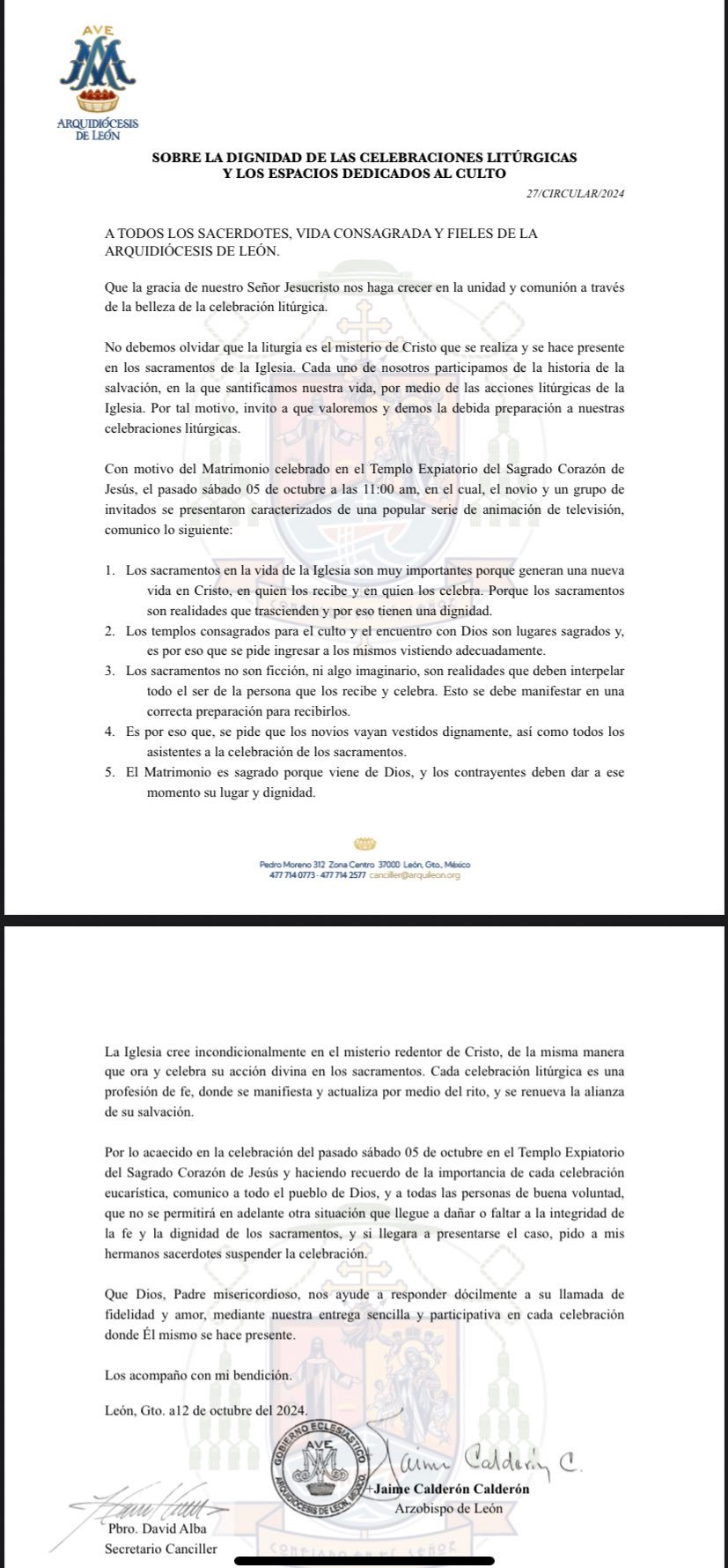 Luego de que se viralizó un video en el que una pareja e invitados protagonizaron una “boda otaku” en el Templo Expiatorio, la Arquidiócesis de León prohibió bodas con este tipo de caracterizaciones. En un comunicado fechado el 12 de octubre, el Arzobispo de León, Jaime Calderón Calderón, pidió a los sacerdotes que eviten celebrar estos sacramentos a personas que asistan con estos atuendos por respeto a los sacramentos de la Iglesia. Aseguró que acudir disfrazados daña la integridad de la fe católica y la dignidad de los sacramentos. “No se permitirá en adelante otra situación que llegue a dañar o faltar a la integridad de la fe y la dignidad de los sacramentos, y si llegara a presentarse el caso, pido a mis hermanos sacerdotes suspender la celebración”, señala el documento. NINGUNA BODA MÁS Fue el pasado 5 de octubre cuando una pareja e invitados acudieron al Templo Expiatorio, ataviados como personajes de “Los Caballeros del Zodiaco”. Además, se pidió a los novios y asistentes de las próximas bodas asistir “vestidos dignamente” esto en forma de respeto a la celebración del sacramento en las iglesias católicas. “Los sacramentos no son ficción, ni algo imaginario, son realidades que deben interpretar todo el ser de la persona que los recibe y celebra. (…) Es por eso que se pide a los novios vayan vestidos dignamente, así como todos los asistentes a la celebración de los sacramentos”, añade la Diócesis. Este es el comunicado: Compartir Navegación de entradas Anuncian 3 nuevos pasos a desnivel para León Carteles reclutan a sicarios de fuera para operar en León