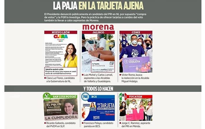 Diarios de circulación nacional como Reforma y El Universal publicaron este miércoles en sus portadas cómo todos los partidos utilizan tarjetas como instrumento de promoción del voto. También otros los partidos PRI, Verde, Morena y PAN, sin que hasta el momento sean investigados, publicó el diario Reforma.