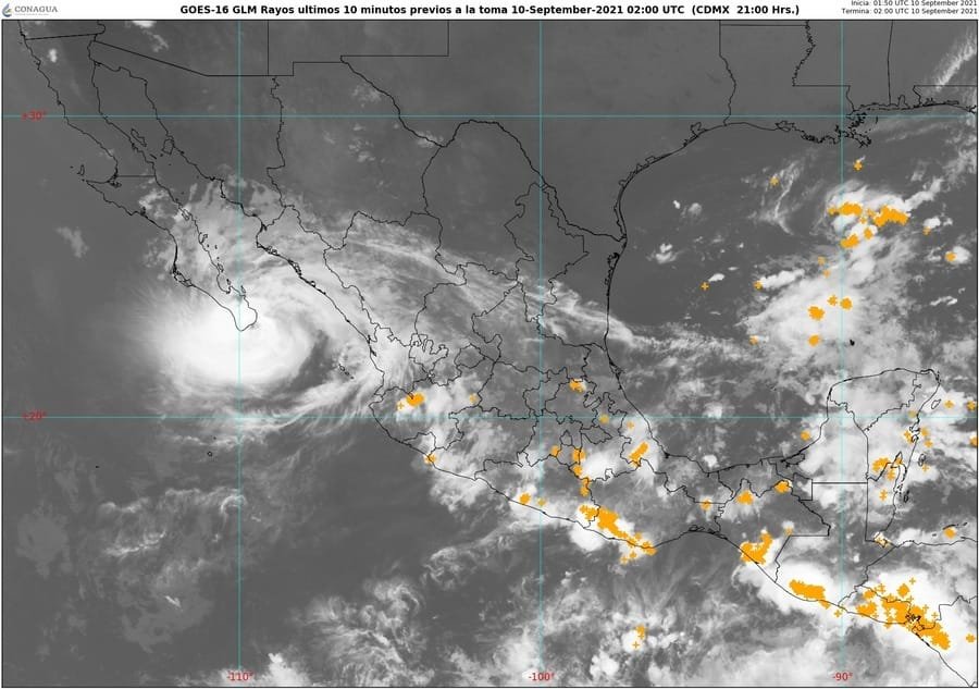 Intervalos de chubascos (5 a 25 mm) en Baja California, Sinaloa, San Luis Potosí, Tamaulipas, Nayarit, Jalisco, Colima, Estado de México y Morelos.
