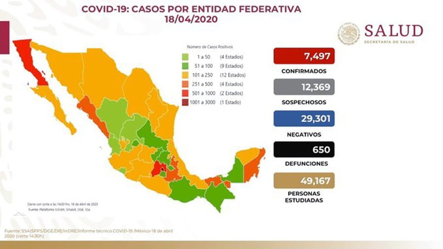 La Secretaría de Salud federal confirmó la noche de este sábado 104 nuevas muertes por coronavirus Covid-19 en México, con lo que suman 650, y 7 mil 497 contagiados, 622 más que el viernes.