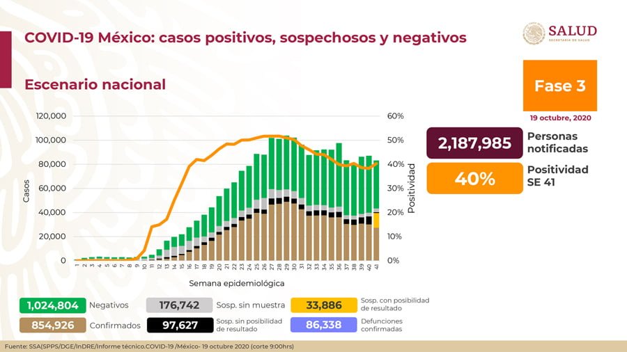 🔊 Escuchar esto La Secretaría de Salud federal informó la noche de este lunes de 171 muertes más por coronavirus Covid-19 en México, con lo que suman 86 mil 338, mientras que la cifra de casos acumulados llegó a 854 mil 926 casos confirmados, 3 mil 699 más que el domingo. La Secretaría de Salud de Guanajuato (SSG) informó por su parte que se registraron 19 decesos más en las últimas 24 horas para sumar 3 mil 137 en la entidad. En conferencia, el director de Epidemiología federal, José Luis Alomía, explicó que además de las defunciones confirmadas, se registran 399 clasificadas como sospechosas y a la espera del resultado de laboratorio. También hay 10 mil 344 decesos sospechosos sin muestra de laboratorio y 4 mil 15 con muestra, pero sin posibilidad de resultado por fallas en el proceso. Con ello, precisó, el registro de defunciones totales por Covid es de 101 mil 96, y se aplicará la dictaminación para descartar o confirmar aquellas sin posibilidad de tener un resultado de laboratorio. El funcionario indicó que el índice de positividad se ubica en 40 por ciento, ligeramente mayor que el de la semana previa. Sin embargo, Alomía dijo que el País está lejos del porcentaje de positividad que hubo en el acmé de la epidemia, el cual fue mayor a 50 por ciento. Mencionó que al corte de este lunes se registran 40 mil 830 casos activos y 623 mil 494 personas recuperadas de la enfermedad. A nivel mundial, hay más de 1 millón 116 mil personas fallecidas a causa de la enfermedad, además de que ya se superaron los 40 millones de contagios. SIN FRENO LOS MUERTOS EN LEÓN En su última actualización, la Secretaría de Salud de Guanajuato (SSG) reportó 19 muertos más por Covid-19 para sumar 3 mil 137 desde que arribó la pandemia. Asimismo, se registraron 187 nuevos casos confirmados para totalizar 46 mil 675. León llegó a 15 mil 741 casos. Además, se encuentran bajo investigación 2 mil 197 casos, mientras que los descartados ascienden a 64 mil 891. Los casos recuperados suman 41 mil 354 y los de transmisión comunitaria llegaron a 46 mil 519. Las defunciones por municipio quedan así: León 1,116 Irapuato 315 Celaya 296 Salamanca 186 Silao 171 Guanajuato capital 85 Cortazar 68 Sn. Luis de la Paz 68 Sn. Fco. Del Rincón 65 Dolores Hidalgo 56 Valle de Santiago 54 Pénjamo 53 Salvatierra 50 Juventino Rosas 47 Villagrán 40 Acámbaro 36 Apaseo el Grande 36 Romita 35 Sn. Miguel de Allende 35 San Felipe 33 Abasolo 30 Purísima del Rincón 26 Comonfort 23 Yuriria 23 San José Iturbide 22 Manuel Doblado 21 Moroleón 18 Uriangato 18 Apaseo el Alto 15 Jaral del Progreso 15 Ocampo 12 Cuerámaro 10 Huanímaro 9 Sn. Diego de la Unión 8 Doctor Mora 7 Jerécuaro 7 Tarimoro 6 Santiago Maravatío 5 Victoria 5 Tarandacuao 4 Tierra Blanca 4 Xichú 3 Pueblo Nuevo 1 Compartir