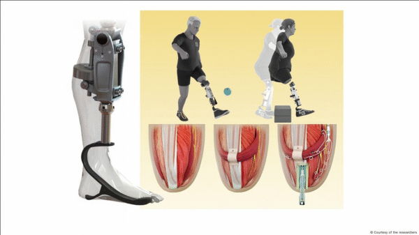 Investigadores del Instituto Tecnológico de Massachusetts (MIT) desarrollaron una nueva rodilla biónica que ayuda a las personas con amputaciones por encima de la rodilla a caminar más rápido, subir escaleras y evitar obstáculos con mayor facilidad que con una prótesis tradicional. A diferencia de las prótesis en las que el muñón se coloca dentro de un encaje, el nuevo sistema se integra directamente con el tejido muscular y óseo del usuario, lo que ofrece al usuario más seguridad y mayor control del movimiento. Además, los participantes del estudio clínico que probaron las prótesis dijeron que sentían la rodilla como parte de su propio cuerpo, lo que no es usual en las personas con amputaciones por encima de esta articulación. “Una prótesis integrada en el tejido, anclada al hueso y controlada directamente por el sistema nervioso, no es simplemente un dispositivo inerte y separado”, dice Hugh Herr, codirector del Centro K. Lisa Yang para la Biónica del MIT y autor principal del nuevo estudio. “Es más bien un sistema cuidadosamente integrado en la fisiología humana, que ofrece un mayor nivel de encarnación protésica”, añadió. Los detalles del estudio clínico fueron publicados en Science. RETROALIMENTACIÓN SENSORIAL En una amputación tradicional, la relación entre los pares de músculos que se estiran y contraen se ve afectada, y eso dificulta Con el nuevo enfoque quirúrgico desarrollado por Herr y su equipo, el interfaz mioneuronal agonista-antagonista (AMI), los pares de músculos se vuelven a conectar durante la cirugía y siguen comunicándose entre sí. Esta retroalimentación sensorial ayuda al usuario de la prótesis a decidir cómo mover la extremidad y genera señales eléctricas que pueden utilizarse para controlar la prótesis. En un estudio de 2024, los investigadores demostraron que las personas con amputaciones por debajo de la rodilla que se sometieron a la cirugía AMI caminaban más rápido y sorteaban obstáculos de forma mucho más natural que las personas con amputaciones tradicionales por debajo de la rodilla. En el nuevo estudio, los investigadores ampliaron el enfoque para atender mejor a las personas con amputaciones por encima de la rodilla. Para ello, insertaron una varilla de titanio en el hueso femoral residual en el lugar de la amputación, un implante que permite un mejor control mecánico y una mayor capacidad de carga que una prótesis tradicional. Además, el implante contiene 16 cables que recogen información de los electrodos situados en los músculos AMI dentro del cuerpo, lo que permite una transducción más precisa de las señales procedentes de los músculos. INTEGRADO AL HUESO Este sistema integrado en el hueso, conocido como e-OPRA, transmite las señales AMI a un nuevo controlador robótico desarrollado específicamente para este estudio. El controlador utiliza esta información para calcular el par necesario para mover la prótesis de la forma que el usuario desea. “Estamos cargando directamente el esqueleto, que es la parte del cuerpo que se supone que debe cargarse, en lugar de utilizar encajes, que son incómodos y pueden provocar frecuentes infecciones cutáneas”, afirma Tony Shu, investigador del MIT y autor principal del estudio. (Texto y fotos: Tomados de DW Español) Compartir Navegación de entradas Remedios para la retención de líquidos Los desconocidos riesgos del Ozempic