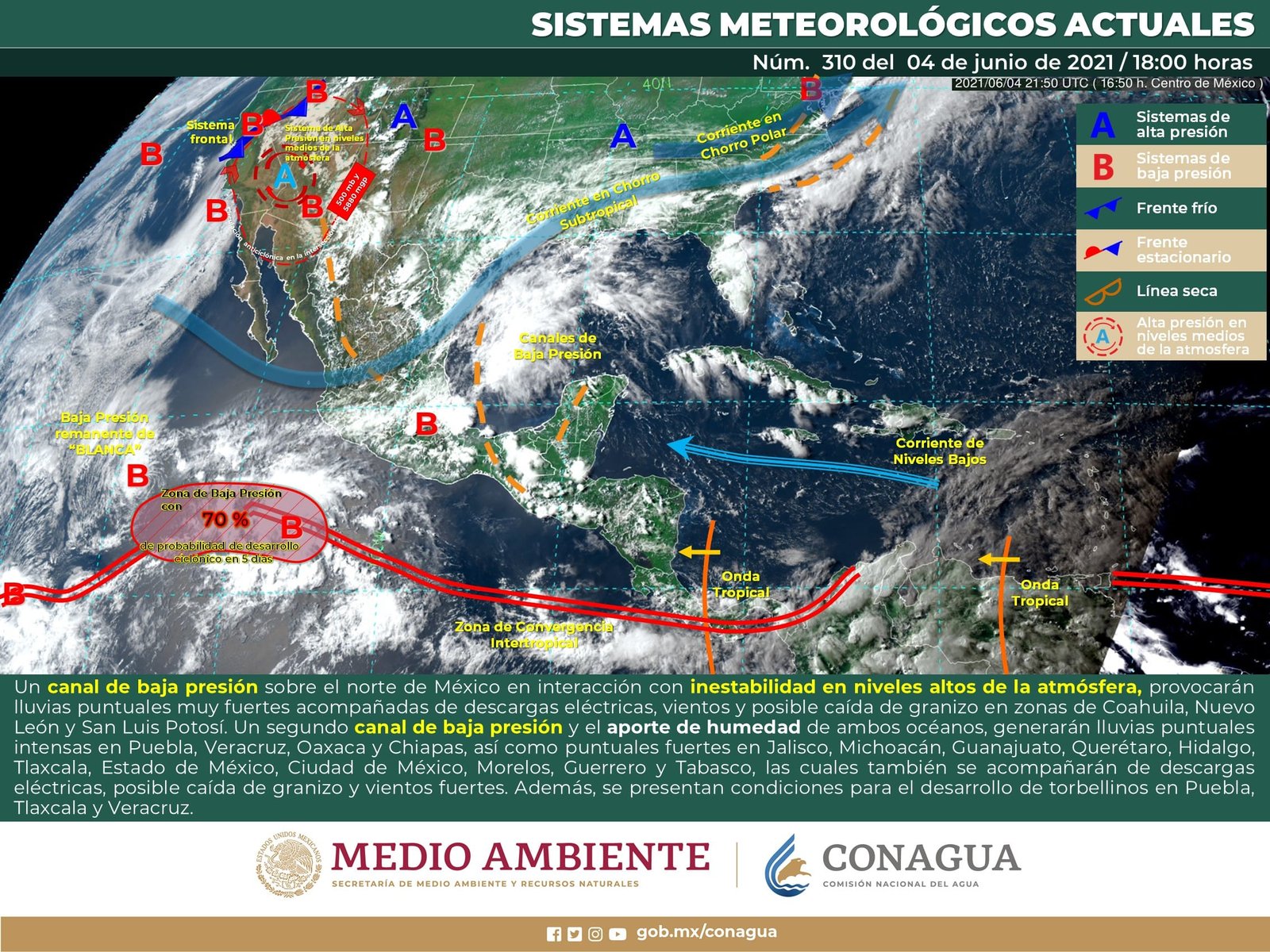 🔊 Escuchar esto Este sábado, Guanajuato tendrá día con nublados, pero las probabilidades de lluvia bajarán a solo 20 por ciento, dio a conocer Servicio Meteorológico Nacional (SMN). De acuerdo con su último reporte, el organismo dependiente de la Comisión Nacional del Agua (Conagua) pronostica que la Mesa Central del país registre cielo nublado la mayor parte del día con lluvias puntuales muy fuertes en Puebla y fuertes en Querétaro, Hidalgo, Morelos y Tlaxcala. Continuará el ambiente fresco al amanecer y templado a cálido por la tarde con viento de dirección variable de 10 a 25 km/h acompañados de rachas de 45 km/h en zonas de tormenta. DÍA NUBLADO Y VIENTO EN GUANAJUATO El reporte indica que Guanajuato tendrá día con nublados, aunque con temperaturas máximas de 30 grados en la mayor parte de su territorio. La probabilidad de lluvia en todo el estado bajará a 20 a 25 por ciento, de acuerdo con el reporte con algunas rachas de viento. El pronóstico indica que los municipios de Irapuato, Salamanca, Celaya, Comonfort, Pénjamo, Dolores Hidalgo, Guanajuato capital y León tendrán máximas de 28 a 29 grados con nublados matutinos y vespertinos. Las temperaturas mínimas promedio en el estado serán de 13 y 14 grados durante la noche y madrugada del domingo. CHUBASCOS EN EL NORTE Para el resto del país, el SMN dijo que un canal de baja presión prevalecerá sobre el norte, occidente, centro y sur del país, en interacción con divergencia en altura y con la entrada de humedad generada por la corriente en chorro subtropical, propiciarán chubascos y lluvias puntuales muy fuertes acompañadas de descargas eléctricas, posibles granizadas y fuertes rachas de viento en las regiones mencionadas. TORMENTAS EN EL ORIENTE Un segundo canal de baja presión sobre el oriente y sureste de México, en combinación con divergencia en altura, originará chubascos y lluvias fuertes a puntuales muy fuertes acompañadas de descargas eléctricas, posibles granizadas y fuertes rachas de viento sobre entidades del noreste, oriente y sureste del territorio nacional, con lluvias puntuales muy fuertes en Puebla, Veracruz y Chiapas. VIGILANCIA A TORMENTA EN EL PACÍFICO Zona de baja presión con probabilidad para desarrollo ciclónico en el océano Pacífico, se localizará al suroeste de las costas de Jalisco y Colima, continuará reforzando la entrada de humedad hacia el occidente del país. Se mantendrá en vigilancia. CALORÓN EN EL SUR Continuará el ambiente vespertino caluroso a muy caluroso sobre entidades del noroeste, occidente, sur y sureste de la República Mexicana, con temperaturas máximas de 40 a 45°C en zonas de Baja California, Sonora, Sinaloa y Campeche. Los sistemas meteorológicos ocasionarán este sábado: Lluvias fuertes con lluvias puntuales muy fuertes (50.1 a 75.0 mm) en los estados Puebla, Veracruz, Guerrero, Oaxaca y Chiapas. Intervalos de chubascos con lluvias puntuales fuertes (25.1 a 50.0 mm) en Nuevo León, Tamaulipas, Jalisco, Querétaro, Michoacán, Estado de México, Hidalgo, Ciudad de México, Morelos, Tlaxcala y Tabasco. Intervalos de chubascos (5.1 a 25.0 mm) en Durango, Zacatecas, San Luis Potosí, Guanajuato, Colima, Campeche, Yucatán y Quintana Roo. Lluvias aisladas (0.1 a 5.0 mm) en Chihuahua, Coahuila, Sinaloa, Nayarit y Aguascalientes. Posible caída de granizo en Coahuila, Nuevo León, Tamaulipas, San Luis Potosí, Durango, Zacatecas, Jalisco, Querétaro, Hidalgo, Estado de México, Ciudad de México, Morelos, Tlaxcala, Puebla, Veracruz, Oaxaca y Chiapas. Posibilidad de tormentas eléctricas en Chihuahua, Coahuila, Nuevo León, Tamaulipas, Sinaloa, Durango, Zacatecas, San Luis Potosí, Jalisco, Colima, Michoacán, Guerrero, Guanajuato, Querétaro, Hidalgo, Estado de México, Ciudad de México, Morelos, Tlaxcala, Puebla, Veracruz, Oaxaca, Chiapas, Tabasco, Campeche y Yucatán. Viento con rachas de 60 a 70 km/h en el Golfo de California y con tolvaneras en Baja California, Sonora y Chihuahua. Viento con rachas de 50 a 60 km/h en Coahuila, Durango, Nuevo León, Tamaulipas, Campeche, Yucatán y Quintana Roo. Temperaturas máximas de 40 a 45 °C en Baja California, Sonora, Sinaloa y Campeche. Temperaturas máximas de 35 a 40 °C en Baja California Sur, Chihuahua, Nuevo León, Tamaulipas, San Luis Potosí, Nayarit, Jalisco, Colima, Michoacán, Guerrero, Veracruz, Tabasco, Yucatán y Quintana Roo. Temperaturas mínimas para la madrugada del domingo de 0 a 5 °C y posibles heladas en zonas montañosas de Chihuahua y Durango. Compartir