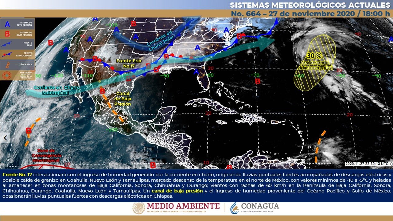 🔊 Escuchar esto Guanajuato continuará este sábado con cielos despejados y temperaturas máximas de 29 grados, dio a conocer el Servicio Meteorológico Nacional (SMN). De acuerdo con su último reporte, el organismo dependiente de la Comisión Nacional del Agua (Conagua) prevé que la Mesa Central del país tenga cielo medio nublado por la mañana con incremento de nubosidad durante la tarde. Se pronostican algunos chubascos solo en Puebla, así como lluvias aisladas en Querétaro e Hidalgo. Bancos de niebla en zonas montañosas y ambiente frío al amanecer con posibles heladas. Viento de dirección variable de 15 a 30 km/h. GUANAJUATO SOLEADO El reporte indicó que Guanajuato mantendrá los cielos despejados con máximas promedio de 27 a 20 grados en municipios como León, Guanajuato capital, Celaya, Irapuato y Salamanca. Las mínimas promedio en el estado oscilarán entre los 8 y 10 grados con algunas rachas de viento nocturnas. No obstante, las zonas altas de la entidad mantendrán heladas durante la madrugada y noche, añadió el reporte. FRÍO Y LLUVIAS EN EL NORTE Y NORESTE Para el resto del país, el SMN dijo el frente frío No. 17 y su masa de aire frío asociada recorrerán el norte y noreste del territorio nacional. Este fenómeno, en interacción con el fuerte arrastre de humedad generado por la corriente en chorro subtropical, provocarán ambiente frío y rachas fuertes de viento sobre las regiones mencionadas, además del noroeste del país. A su vez, se prevén chubascos y lluvias fuertes acompañadas de descargas eléctricas sobre Coahuila, Nuevo León y Tamaulipas. INTERVALOS DE LLUVIAS EN EL SUR Un canal de baja presión sobre el sur del Golfo de México en interacción con el ingreso de humedad del Océano Pacífico, Golfo de México y Mar Caribe, continuará generando lluvias e intervalos de chubascos sobre entidades del oriente, sur y sureste del país, incluida la Península de Yucatán, con lluvias puntuales fuertes en Chiapas. POCAS LLUVIAS EN EL CENTRO En el resto de la República Mexicana prevalecerá escasa probabilidad de lluvias. Asimismo, se mantendrá el ambiente frío con heladas durante la madrugada sobre entidades de la Mesa Central, además de presencia de bancos de niebla matutinos sobre las entidades de la Sierra Madre Oriental. Los sistemas meteorológicos ocasionarán este sábado: Intervalos de chubascos con lluvias puntuales fuertes (25 a 50 mm) acompañadas de descargas eléctricas y rachas fuertes de viento durante las tormentas en Nuevo León (norte) y Tamaulipas (norte). Intervalos de chubascos (5.1 a 25 mm) acompañados de descargas eléctricas y rachas fuertes de viento durante las tormentas en los estados de Coahuila, San Luis Potosí, Puebla, Veracruz, Chiapas, Campeche, Yucatán y Quintana Roo. Lluvias aisladas (0.1 a 5.0 mm) en Querétaro, Hidalgo, Estado de México, Michoacán, Guerrero, Oaxaca y Tabasco. Viento con rachas de 60 a 70 km/h y tolvaneras en Baja California. Viento con rachas de 50 a 60 km/h en Mar de Cortés, Baja California Sur, Sonora, Sinaloa, Coahuila, Nuevo León y Tamaulipas. Temperaturas máximas de 35 a 40°C en Michoacán y Guerrero. Temperaturas mínimas para la madrugada del domingo de -10 a -5°C con heladas en las zonas montañosas de Sonora, Chihuahua y Durango. Temperaturas mínimas para la madrugada del domingo de -5 a 0°C con heladas en zonas montañosas de Baja California, Coahuila y Estado de México. Temperaturas mínimas para la madrugada del domingo de 0 a 5°C y posibles heladas en zonas montañosas de Nuevo León, Zacatecas, Veracruz, Puebla y Tlaxcala. Compartir