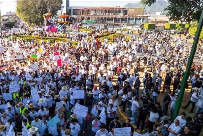 Tras avanzar por calles de Uruapan, miles de ciudadanos, comerciantes, trabajadores municipales y estudiantes llegaron al Centro Histórico para exigir un alto a la inseguridad, las extorsiones y los asesinatos.