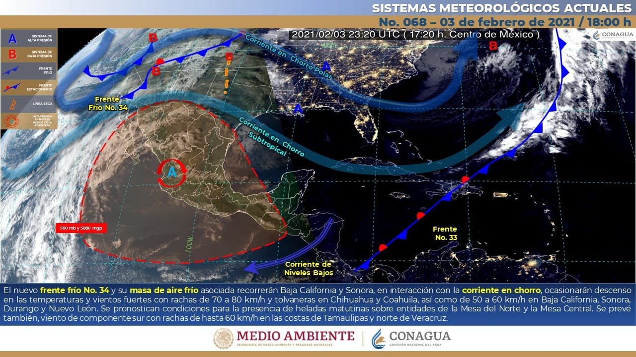 🔊 Escuchar esto Guanajuato mantendrá este jueves altas temperaturas con máximas hasta de 30 grados y nula probabilidad de lluvia, dio a conocer el Servicio Meteorológico Nacional (SMN). De acuerdo con su último reporte, el organismo dependiente de la Conagua pronostica que la Mesa Central del país tendrá escasa nubosidad y nula probabilidad de lluvia en toda la región. Ambiente frío por la mañana y por la tarde algunas rachas de viento. GUANAJUATO SIN HELADAS El reporte indica que todos los municipios de Guanajuato tendrán cielos despejados y solo algunas rachas de viento por la tarde. Las máximas promedio en la entidad, incluidos los municipios del noreste, tendrán de 28 hasta 30 grados con apenas 5 por ciento de probabilidad de lluvia. Las mínimas en todo el estado oscilarán entre 7 y 8 grados durante la madrugada y noche con algunas rachas de viento. No obstante, algunas zonas altas del estado podrían registrar 5 grados de mínimas. VIENTO Y TOLVANERAS EN EL PAÍS Para el resto del país, el SMN dijo que el frente frío No. 34 se desplazará sobre el noroeste y norte de la República Mexicana, continuará interactuando con la corriente en chorro subtropical, manteniendo vientos fuertes con tolvaneras y ambiente frío sobre las regiones mencionadas. Circulación anticiclónica en niveles medios y altos de la atmósfera predominará sobre gran parte del territorio nacional ocasionando ambiente diurno cálido a caluroso y sin probabilidad de lluvias. HELADAS EN EL NORTE A su vez, se pronostican condiciones para la presencia de heladas matutinas (por irradiación) sobre entidades de la Mesa del Norte y la Mesa Central, así como vientos de componente sur en el litoral del Golfo de México. Estos fenómenos ocasionarán para este jueves: Lluvias aisladas (0.1 a 5.0 mm) en los estados de Tamaulipas, Oaxaca, Chiapas y Quintana Roo. Viento con rachas de 60 a 70 km/h con tolvaneras en Chihuahua. Viento con rachas de 50 a 60 km/h en el Golfo de California, Baja California, Baja California Sur, Sonora, Coahuila, Nuevo León y costa de Jalisco Viento de componente sur con rachas de 40 a 60 km/h en el litoral de Tamaulipas, Veracruz, Tabasco, Campeche y Yucatán. Oleaje de 1 a 2 m de altura significante en la costa occidental de Baja California. Temperaturas máximas de 40 a 45°C en Michoacán y Guerrero. Temperaturas máximas de 35 a 40°C en Nuevo León, Tamaulipas, San Luis Potosí, Sinaloa, Nayarit, Jalisco, Estado de México (suroeste) y Morelos (sur). Temperaturas mínimas para la madrugada del viernes de -10 a -5°C con heladas en las zonas montañosas de Sonora, Chihuahua y Durango. Temperaturas mínimas para la madrugada del viernes de -5 a 0°C con heladas en zonas montañosas de Baja California, Coahuila y Zacatecas. Temperaturas mínimas para la madrugada del viernes de 0 a 5°C y posibles heladas en zonas montañosas de Nuevo León, Aguascalientes, Jalisco (norte), Guanajuato, Ciudad de México, Hidalgo, Estado de México, Tlaxcala, Puebla y Veracruz. Compartir