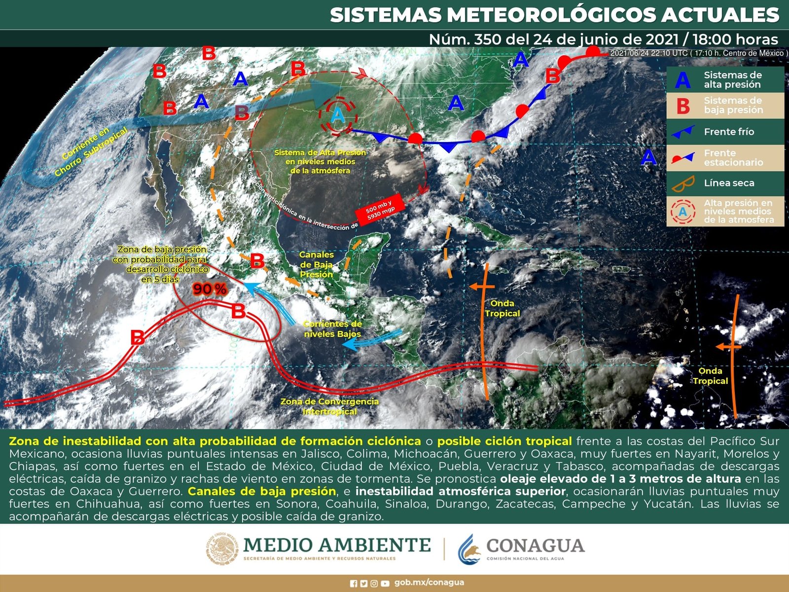 🔊 Escuchar esto Este viernes Guanajuato tendrá pocos cambios de temperatura con altas probabilidades de lluvia y nublados durante el día, dio a conocer el Servicio Meteorológico Nacional (SMN). De acuerdo con su último reporte, el organismo dependiente de la Comisión Nacional del Agua (Conagua) la Mesa Central del país tendrá cielo nublado con lluvias puntuales muy fuertes en Puebla; fuertes en Guanajuato, Morelos y Tlaxcala e intervalos de chubascos en Querétaro e Hidalgo, todas con descargas eléctricas y posible caída de granizo. Los vientos estarán acompañados de rachas de 50 km/h en zonas de tormenta, incluido Guanajuato. ALTA HUMEDAD EN GUANAJUATO Según el reporte, Guanajuato mantendrá de 45 a 60 por ciento de probabilidad de lluvia en todo el territorio con rachas de viento. Las temperaturas máximas promedio en la entidad serán de 25 grados con mínimas promedio de 14 grados. Se espera que los intervalos de chubascos se presenten en la tarde y noche con humedad hasta de 80 por ciento. Los municipios del noreste tendrán las temperaturas más bajas con 23 de máximas y mínimas de 11 y 12 grados. SE APROXIMA HURACÁN DESDE EL PACÍFICO Para el resto del país, el SMN dijo que una zona de inestabilidad con alto potencial ciclónico o posible ciclón tropical bordeará las costas del Pacífico Central. Este fenómeno generará lluvias muy fuertes a puntuales intensas en el occidente y sur del territorio nacional, además de originar entrada de humedad con chubascos y lluvias fuertes acompañadas de actividad eléctrica en el centro del país. Asimismo, se prevén vientos fuertes y oleaje elevado en las costas de Guerrero, Michoacán, Colima y Jalisco. LLUVIAS EN CENTRO Y SUR Canales de baja presión en interacción con divergencia en altura, continuarán generando chubascos y lluvias fuertes a muy fuertes acompañadas de actividad eléctrica y posibles granizadas sobre entidades del noroeste, norte, noreste, oriente y sureste del país, incluida la Península de Yucatán. Finalmente, una circulación anticiclónica en niveles medios de la atmósfera mantendrá el ambiente vespertino caluroso a muy caluroso sobre entidades del noroeste, norte, noreste y sureste de México, incluida la Península de Yucatán. Los sistemas meteorológicos ocasionarán este viernes: Lluvias muy fuertes con lluvias puntuales intensas (75.1 a 150.0 mm) en los estados de Jalisco, Colima, Michoacán y Guerrero. Lluvias fuertes con lluvias puntuales muy fuertes (50.1 a 75.0 mm) en Nayarit, Oaxaca y Chiapas. Intervalos de chubascos con lluvias puntuales fuertes (25.1 a 50.0 mm) en Sonora, Chihuahua, Sinaloa, Guanajuato, Estado de México, Ciudad de México, Morelos, Tlaxcala, Puebla, Veracruz, Campeche, Yucatán y Quintana Roo. Intervalos de chubascos (5.1 a 25.0 mm) en Durango, Tamaulipas, Zacatecas, San Luis Potosí, Querétaro, Hidalgo y Tabasco. Posible caída de granizo en Sonora, Sinaloa, Chihuahua, Durango, Coahuila, Nayarit, Jalisco, Michoacán, Guanajuato, Querétaro, Hidalgo, Ciudad de México, Estado de México, Morelos, Veracruz, Puebla, Tlaxcala, Guerrero, Oaxaca, Chiapas, Campeche y Yucatán. Posibilidad de tormentas eléctricas en Sonora, Chihuahua, Coahuila, Nuevo León, Tamaulipas, San Luis Potosí, Zacatecas, Durango, Sinaloa, Nayarit, Jalisco, Colima, Michoacán, Aguascalientes, Guanajuato, Querétaro, Hidalgo, Veracruz, Puebla, Tlaxcala, Estado de México, Ciudad de México, Morelos, Guerrero, Oaxaca, Chiapas, Tabasco, Campeche, Yucatán y Quintana Roo. Viento con rachas de 60 a 80 km/h en costas de Guerrero, Michoacán y Colima. Viento con rachas de 60 a 70 km/h en Coahuila. Viento con rachas de 50 a 60 km/h en Sonora, Chihuahua, Nuevo León, Tamaulipas, Durango, Zacatecas, San Luis Potosí, Aguascalientes, Guanajuato y costa de Jalisco. Oleaje de 2 a 4 metros de altura significante en costas de Guerrero, Michoacán y Colima, y de 1 a 2 metros de altura significante en la costa de Jalisco. Temperaturas máximas de 40 a 45 °C en Baja California, Sonora y Nuevo León. Temperaturas máximas de 35 a 40 °C en Baja California Sur, Sinaloa, Chihuahua, Coahuila, Tamaulipas, Nayarit, Durango, San Luis Potosí, Veracruz (norte), Campeche, Yucatán y Quintana Roo. Temperaturas mínimas para la madrugada del sábado de 0 a 5 °C y posibles heladas en zonas montañosas del Estado de México, Puebla y Tlaxcala. Compartir