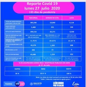 🔊 Escuchar esto La Secretaría de Salud federal dio a conocer la noche de este lunes 342 nuevas muertes por coronavirus Covid-19 en el país, con lo que suman 44 mil 22, mientras que los casos acumulados llegaron a 395 mil 489, 4 mil 973 más que el domingo. La Secretaría de Salud de Guanajuato (SSG) reportó a su vez 21 nuevas defunciones por Covid-19 y 431 casos positivos más. [read more=”Leer más” less=”Leer menos”] 🔊 Nota completa En conferencia desde Palacio Nacional, el director de Epidemiología, José Luis Alomía, informó que hay 85 mil 986 casos sospechosos y suman 442 mil 884 negativos, así como 256 mil 777 recuperados. De acuerdo con el reporte técnico diario, actualmente hay 47 mil 655 casos activos estimados, es decir, personas que iniciaron con síntomas en los últimos 14 días y quienes podrían transmitir el virus, número que representa el 11 por ciento de los casos confirmados. En cuanto a hospitalización, a nivel nacional hay un 47 por ciento de ocupación en camas generales, siendo Nuevo León y Tabasco los estados que rebasan el límite de seguridad de 70 por ciento. Mientras que en camas con ventilador, hay una ocupación de 38 por ciento a nivel nacional y Nuevo León se encuentra al límite con 70 por ciento. La hipertensión, la obesidad y la diabetes continúan siendo, respectivamente, los primeros tres padecimientos asociados a los decesos por coronavirus. Los casos confirmados en el mundo son 16 millones 144 mil 449, de acuerdo con la Organización Mundial de la Salud. GUANAJUATO CON MÁS DE 20 MIL CASOS En su última actualización, la Secretaría de Salud de Guanajuato (SSG) reportó que la cifra de contagios por Covid-19 llegó a 20 mil 271, un total de 431 casos más que el domingo. Asimismo, reportó 21 decesos más en las últimas 24 horas para llegar a mil 224 desde que apareció la pandemia en la entidad. Entre los decesos se reportó la muerte de una bebé de apenas 7 meses residente del municipio de Silao que no representaba ninguna comorbilidad, añadió la SSG. León se mantiene como el municipio con más casos positivos de Covid-19 con un total de 8 mil 358 y 452 defunciones. Las defunciones por municipio quedan así: León 452 Celaya 133 Irapuato 128 Silao 98 Salamanca 55 Romita 29 Guanajuato capital 28 Cortazar 27 Juventino Rosas 27 Pénjamo 24 Sn. Luis de la Paz 23 Sn. Fco. Del Rincón 22 Dolores Hidalgo 21 Valle de Santiago 15 Sn. Miguel de Allende 11 Acámbaro 10 Apaseo el Grande 10 Salvatierra 10 Villagrán 10 Abasolo 9 Apaseo el Alto 8 Moroleón 8 Purísima del Rincón 8 Comonfort 7 San José Iturbide 6 Doctor Mora 4 Uriangato 4 Yuriria 4 Cuerámaro 3 Huanímaro 3 Jaral del Progreso 3 Jerécuaro 3 Santiago Maravatío 3 Manuel Doblado 2 Ocampo 2 San Felipe 2 Tarandacuao 2 Tarimoro 2 Victoria 2 Sn. Diego de la Unión 2 Pueblo Nuevo 1 Tierra Blanca 1 Xichú 1 [/read] Compartir