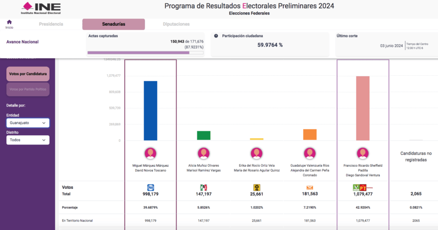 La ola guinda en Guanajuato también está por llevarse el Senado. Con el 88 por ciento de las actas capturadas en el Programa de Resultados Electorales Preliminares (PREP), el candidato de Morena al Senado por Guanajuato, Ricardo Sheffield, tenía una ventaja de tres puntos sobre Miguel Márquez, candidato del PAN. El ex titular de Profeco acumulaba 42.9 por ciento de los votos, mientras que el ex mandatario guanajuatense sumaba 39.6 por ciento. En un tercer lugar se ubicaba Guadalupe Valenzuela Ríos de Movimiento Ciudadano con 7.2 por ciento de los votos. PAREJOS EN TODO Miguel Márquez y Sheffield Padilla protagonizaron uno de los debates más encendidos en la contienda electoral recién concluida. Ambos se enfrascaron en acusaciones mutuas sobre su paso como en la alcaldía de León y en la dependencia federal, en el caso de Sheffield, y el desempeño de Márquez en materia de seguridad durante su mandato 2012-2018. Debido a lo cerrado de esta contiende, existe la posibilidad de que la contienda se resuelva en unas semanas más. Compartir Navegación de entradas Xóchitl Gálvez incluso perdió en Guanajuato por 6 puntos ONU destaca la tendencia mundial por las mujeres presidentas