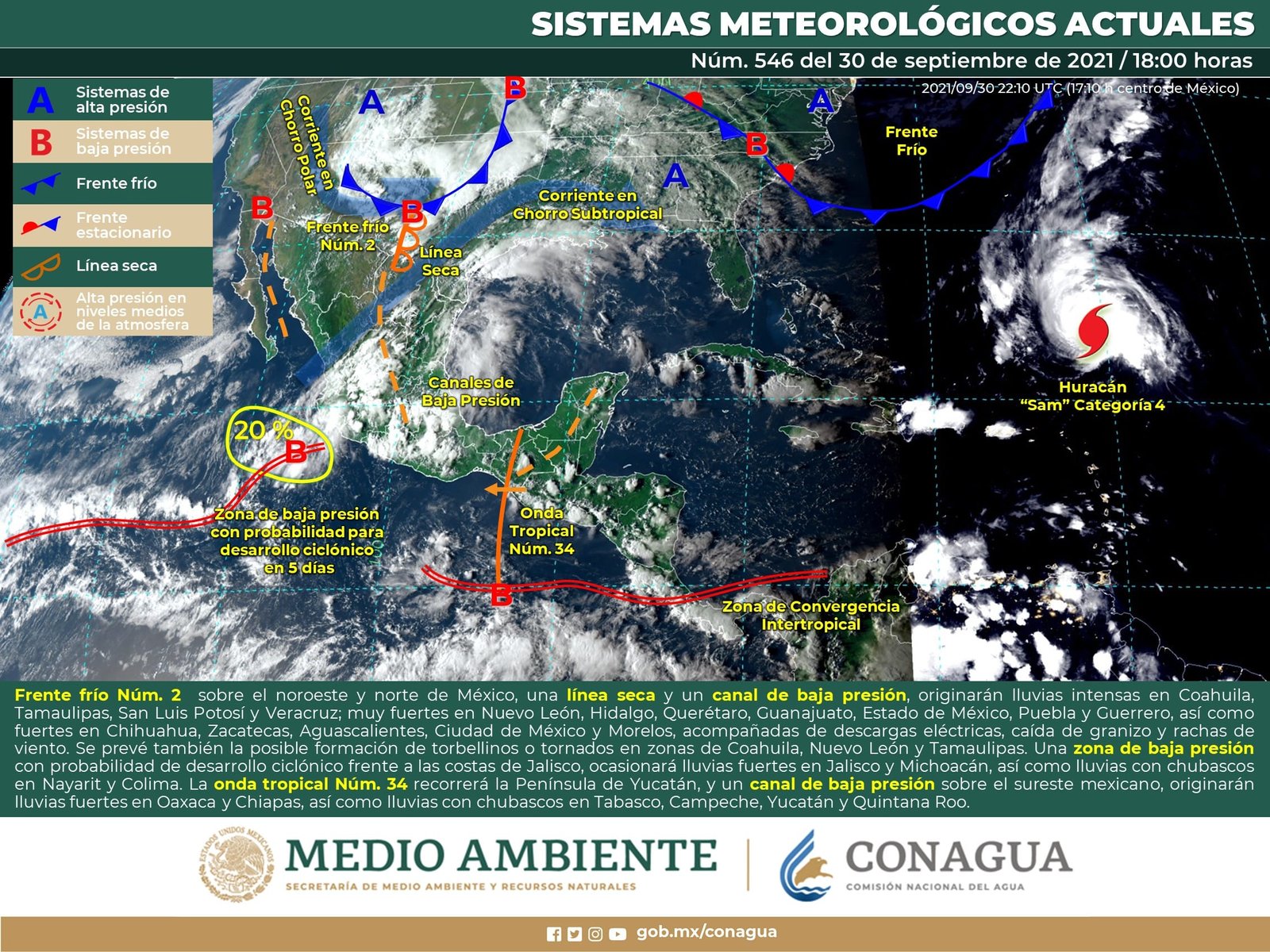 🔊 Escuchar esto Este viernes, Guanajuato mantendrá latente la amenaza de lluvia durante la noche con temperaturas máximas de 24 grados, dio a conocer el Servicio Meteorológico Nacional (SMN). De acuerdo con su último reporte, el organismo dependiente de la Conagua pronostica que la Mesa Central del país registre cielo nublado la mayor parte del día con lluvias muy fuertes en Guanajuato, Querétaro, Hidalgo, Puebla y Tlaxcala, así como lluvias fuertes en Morelos, todas con descargas eléctricas y posible caída de granizo. Seguirá el ambiente fresco durante la mañana en la región, con bancos de niebla y temperaturas frías en zonas montañosas, mientras que los vientos del este y noreste 10 a 20 km/h tendrán rachas de 40 km/h. AMENAZAN TORMENTAS EN GUANAJUATO El reporte indica que Guanajuato tiene probabilidad de tormentas nocturnas con nublados a lo largo del día. Las temperaturas máximas promedio serán de 24 grados en la mayor parte del estado y solo los municipios del noreste tendrán 21 grados de promedio. Se espera que las lluvias sean entrada la noche con 60-70 por ciento de probabilidad en los municipios que conforman el corredor industrial, según el reporte. Las temperaturas mínimas en todo el estado serán de 12 a 13 grados en la noche y madrugada del sábado. LLEGA FRENTE FRÍO 2 Para el resto del país, el SMN dijo que un nuevo frente frío Núm. 2 se extenderá sobre el norte de México. Este fenómeno, en interacción con un canal de baja presión sobre la Mesa del Norte y la Mesa Central y con divergencia en altura, ocasionarán chubascos y lluvias fuertes a muy fuertes acompañadas de descargas eléctricas y posibles granizadas sobre entidades del norte, noreste, occidente, centro y oriente del país. La zona de baja presión se ubicará frente a las costas de Jalisco, continuará reforzando el potencial de lluvias en el occidente y sur del país. ONDA TROPICAL EN LA PENÍNSULA La onda tropical 34 recorrerá el sureste mexicano y en interacción con un canal de baja presión sobre la Península de Yucatán, originará chubascos y lluvias fuertes acompañadas de descargas eléctricas y rachas de viento en las regiones mencionadas. Finalmente, prevalecerá el ambiente vespertino caluroso sobre entidades del norte y noreste de México, así como en la Península de Yucatán. Los sistemas meteorológicos mencionados ocasionarán este viernes: Lluvias fuertes con puntuales muy fuertes (50 a 75 mm) en Coahuila, Nuevo León, Tamaulipas, San Luis Potosí, Guanajuato, Querétaro, Hidalgo, Puebla, Tlaxcala, Veracruz, Oaxaca y Chiapas. Intervalos de chubascos con lluvias puntuales fuertes (25 a 50 mm) en Zacatecas, Jalisco, Michoacán, Guerrero, Morelos, Ciudad de México, Estado de México, Campeche, Yucatán y Quintana Roo. Intervalos de chubascos (5 a 25 mm) en Baja California Sur, Chihuahua, Durango, Aguascalientes, Nayarit, Colima y Tabasco. Posible caída de granizo en Coahuila, Nuevo León, Tamaulipas, San Luis Potosí, Zacatecas, Aguascalientes, Jalisco, Michoacán, Guanajuato, Querétaro, Hidalgo, Veracruz, Puebla, Estado de México, Ciudad de México y Morelos. Viento con rachas de 50 a 60 km/h en Coahuila, Nuevo León y Tamaulipas. Temperaturas máximas de 35 a 40 °C en Nuevo León, Tamaulipas, Campeche, Yucatán y Quintana Roo. Temperaturas mínimas para la madrugada del sábado de -5 a 0 °C y heladas en zonas montañosas de Chihuahua y Durango. Temperaturas mínimas para la madrugada del sábado de 0 a 5 °C y posibles heladas en zonas montañosas del Estado de México, Tlaxcala y Puebla. Compartir