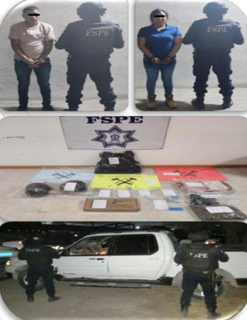 • En la colonia El Molinito se detuvo a un sujeto y a una mujer femenina con un arma, 12 cartuchos, un cargador, 94 dosis de cristal, 170 dosis de piedra, 900 dosis de marihuana, un vehículo con reporte de robo y equipo balístico.
