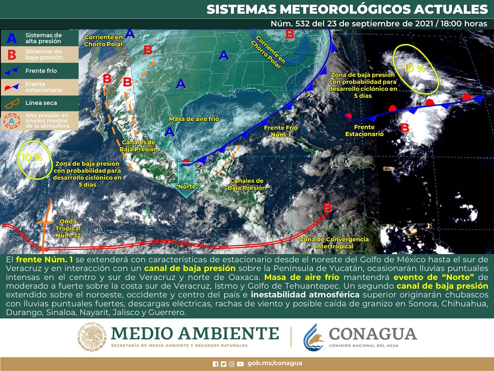 🔊 Escuchar esto Este viernes, Guanajuato continuará con altas temperaturas y baja probabilidad de lluvia, dio a conocer el Servicio Meteorológico Nacional (SMN). De acuerdo con su último reporte, el organismo dependiente de la Comisión Nacional del Agua (Conagua) pronostica que la Mesa Central del país registrará cielo nublado la mayor parte del día con probabilidad de lluvias puntuales fuertes en Puebla, así como intervalos de chubascos en Querétaro, Hidalgo, Tlaxcala y Morelos y probables en Guanajuato. Se espera ambiente templado por la tarde en la región con viento del norte y noreste 10 a 20 km/h acompañado de rachas de 30 a 40 km/h. NUBLADOS NOCTURNOS EN GUANAJUATO Para Guanajuato, el reporte señala que tendrá día despejado con temperaturas máximas de 26 grados con baja probabilidad de lluvia. No obstante, se esperan nublados a lo largo de la noche en la mayor parte del territorio estatal. Los municipios de León, Guanajuato capital, Celaya, Comonfort, Pénjamo, San Miguel de Allende, Salamanca e Irapuato tendrán día soleado con máximas promedio de 25 y mínimas de 12 grados. Los municipios del noreste tendrán noche fresca con mínimas de 10 grados durante la noche y madrugada del sábado. SE MANTIENE FRENTE FRÍO EN EL GOLFO Para el resto del país, el SMN dijo que el frente Núm. 1 se extenderá con características de estacionario sobre el Golfo de México y el sureste del país. Este fenómeno producirá chubascos y lluvias fuertes a muy fuertes acompañadas de descargas eléctricas en el oriente y sureste del territorio nacional, así como en la Península de Yucatán. La masa de aire frío asociada al frente mantendrá un ligero descenso de la temperatura en el norte, noreste, oriente y centro de la República Mexicana. LLUVIAS EN EL NORTE Y OCCIDENTE Por otra parte, un canal de baja presión extendido a lo largo de la Sierra Madre Occidental e inestabilidad atmosférica superior ocasionarán lluvias e intervalos de chubascos con descargas eléctricas y posible caída de granizo en el noroeste, occidente, centro y sur del país. Asimismo, prevalecerá el ambiente vespertino caluroso sobre entidades del noroeste y occidente de México, además de la Península de Yucatán. Los sistemas meteorológicos mencionados ocasionarán este viernes: Lluvias fuertes con puntuales muy fuertes (50 a 75 mm) en los estados de Veracruz, Oaxaca y Chiapas. Intervalos de chubascos con lluvias puntuales fuertes (25 a 50 mm) en Puebla, Tabasco y Campeche. Intervalos de chubascos (5 a 25 mm) en Baja California, Sonora, Chihuahua, Nuevo León, Tamaulipas, Zacatecas, Durango, Sinaloa, Nayarit, Jalisco, Colima, Michoacán, Guerrero, Morelos, Estado de México, Tlaxcala, Yucatán y Quintana Roo. Lluvias aisladas (0.1 a 5 mm) en Baja California Sur, Coahuila, San Luis Potosí, Aguascalientes, Guanajuato, Querétaro, Hidalgo y Ciudad de México. Posible caída de granizo en Sonora, Chihuahua, Zacatecas, Durango, Sinaloa, Oaxaca y Veracruz. Viento de componente norte con rachas de 50 a 60 km/h en Istmo y Golfo de Tehuantepec. Viento con rachas de 50 a 60 km/h en Coahuila, Nuevo León y Tamaulipas. Temperaturas máximas de 35 a 40 °C en Baja California, Sonora, Sinaloa, Campeche y Yucatán. Temperaturas mínimas para la madrugada del sábado de 0 a 5 °C y posibles heladas en zonas montañosas de Chihuahua, Durango, Michoacán, Estado de México, Tlaxcala, Puebla e Hidalgo. Compartir
