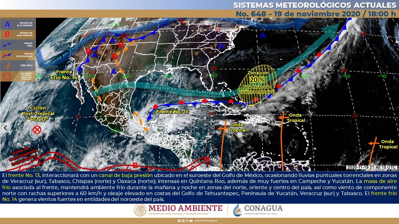 🔊 Escuchar esto Este viernes, Guanajuato continuará con bajas temperaturas y rachas de viento nocturnas, dio a conocer el Servicio Meteorológico Nacional (SMN). De acuerdo con su último reporte, el organismo dependiente de la Conagua prevé que para la Mesa Central del país se registre cielo medio nublado por la mañana con incremento de nubosidad durante la tarde con lluvias puntuales intensas en Puebla, intervalos de chubascos en Hidalgo, Querétaro y Tlaxcala. Podrían presentarse lluvias aisladas en Morelos y Guanajuato. Se espera ambiente frío con nieblas matutinas en zonas montañosas. HELADAS EN GUANAJUATO Además, viento del este y noreste de 15 a 30 km/h con rachas de 40 a 50 km/h en Querétaro e Hidalgo. Los municipios de León, Guanajuato capital, Dolores Hidalgo, Celaya, Comonfort, Salamanca e Irapuato tendrán máximas de 26 a 27 grados con cielos despejados y rachas de viento nocturnas. Se espera que las mínimas en esos municipios sean de 8 a 9 grados durante la madrugada y noche. Los municipios del noreste tendrán máximas de 23 grados durante el día y mínimas de 6 a 7 grados. LLUVIAS EN EL ORIENTE Y SURESTE Para el resto del país, el SMN dijo que un canal de baja presión extendido sobre el suroeste y sur del Golfo de México, en interacción con la masa de aire frío que impulsó al frente No. 13, provocarán lluvias fuertes a intensas en el oriente y sureste de México, incluida la Península de Yucatán. Además, se tendrá ambiente frío durante la mañana y noche con heladas sobre entidades del norte, noreste, oriente y centro del país. También se presentarán bancos de niebla matutinas en sierras de dichas regiones, así como viento de componente norte con rachas fuertes a intensas en el sur del litoral del Golfo de México, la Península de Yucatán e Istmo y Golfo de Tehuantepec. FRENTE FRÍO 14 LLEGA AL NORESTE Asimismo, el frente frío No. 14 se extenderá sobre el noroeste de la República Mexicana, generando rachas fuertes de viento en dicha región. Finalmente, una nueva onda tropical se aproximará a la Península de Yucatán, incrementando la probabilidad de lluvias en dicha región. Los sistemas meteorológicos ocasionarán este viernes: Lluvias muy fuertes con lluvias puntuales intensas (75 a 150 mm) acompañadas de descargas eléctricas, granizadas y rachas fuertes de viento durante las tormentas en los estados de Puebla Veracruz, Oaxaca, Tabasco y Chiapas. Lluvias fuertes con lluvias puntuales muy fuertes (50 a 75 mm) acompañadas de descargas eléctricas, granizadas y rachas fuertes de viento durante las tormentas en Quintana Roo. Intervalos de chubascos con lluvias puntuales fuertes (25 a 50 mm) acompañadas de descargas eléctricas y rachas fuertes de viento durante las tormentas en Campeche y Yucatán. Intervalos de chubascos (5.1 a 25 mm) acompañados de descargas eléctricas y rachas fuertes de viento durante las tormentas en Tamaulipas, San Luis Potosí, Hidalgo, Querétaro, Tlaxcala y Estado de México. Lluvias aisladas (0.1 a 5 mm) en Nuevo León, Guanajuato, Michoacán, Guerrero, Morelos y Ciudad de México. Viento de componente norte con rachas de 70 a 90 km/h en Istmo y Golfo de Tehuantepec, de 50 a 60 km/h en el litoral de Veracruz (sur), Yucatán y Quintana Roo, y de 40 a 50 km/h en la costa de Tabasco y Campeche. Oleaje de 2 a 4 metros de altura significativa en el Golfo de Tehuantepec y costa de Quintana Roo y de 1 a 2 metros de altura significativa en el litoral de Veracruz, Tabasco, Campeche y Yucatán. Viento con rachas de 40 a 50 km/h en Baja California Sur, Mar de Cortés, Coahuila, Querétaro, Hidalgo, San Luis Potosí y Zacatecas. Temperaturas máximas de 35 a 40°C en Baja California Sur, Sonora, Sinaloa, Nayarit, Colima, Michoacán y Guerrero. Temperaturas mínimas para la madrugada del sábado de -5 a 0°C con heladas en zonas montañosas de Chihuahua, Durango y Estado de México. Temperaturas mínimas para la madrugada del sábado de 0 a 5°C y posibles heladas en zonas montañosas de Baja California, Coahuila, Nuevo León, Zacatecas, Aguascalientes, Jalisco, Michoacán, Guanajuato, Querétaro, Hidalgo, Veracruz, Puebla y Tlaxcala. Compartir