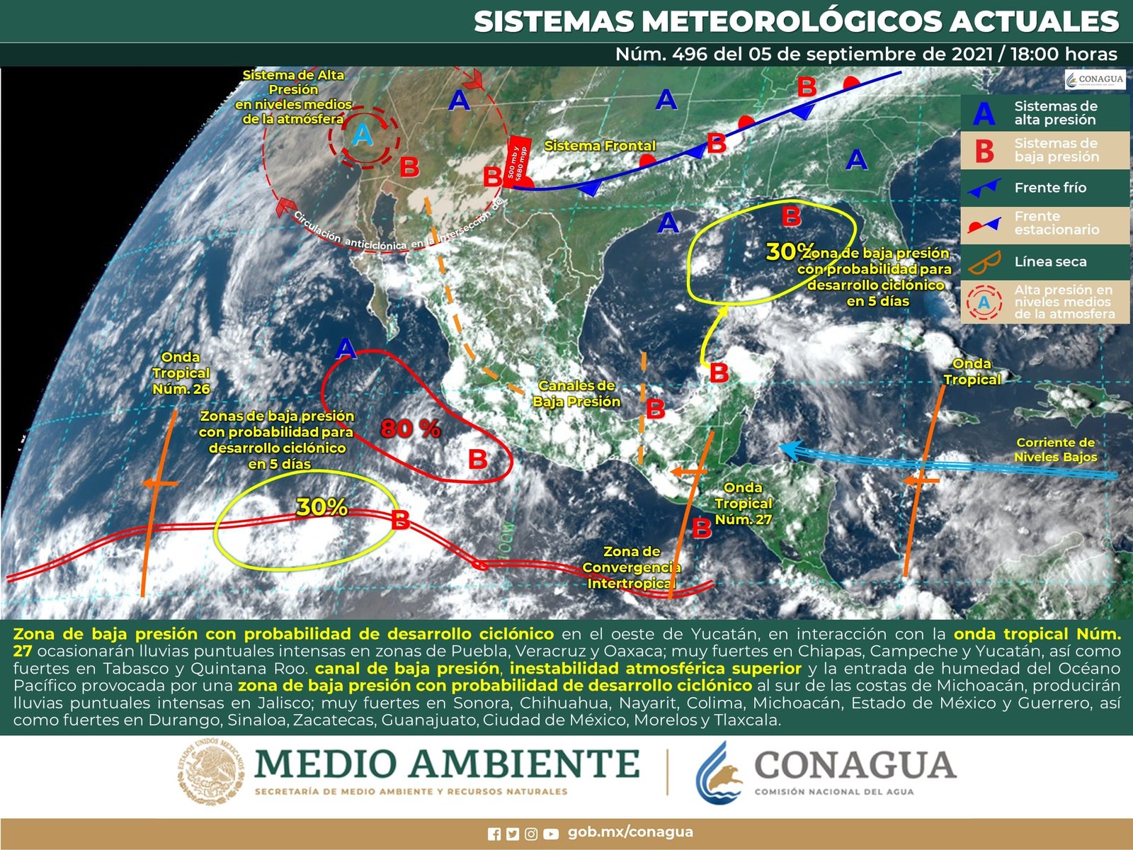 🔊 Escuchar esto Guanajuato continuará este lunes con intervalos de lluvias nocturnas, debido al paso de un canal de baja presión, dio a conocer el Servicio Meteorológico Nacional (SMN). De acuerdo con su último reporte, el organismo dependiente de la Conagua pronostica que la Mesa Central del país tendrá cielo medio nublado por la mañana y nublado hacia la tarde con probabilidad de lluvias puntuales muy fuertes en Guanajuato, Querétaro, Hidalgo y Puebla; así como fuertes en Morelos y Tlaxcala, todas con descargas eléctricas y probable caída de granizo. Se espera que el viento del este y noreste de 15 a 30 km/h esté acompañado de rachas de hasta 40 km/h en zonas de tormenta. GUANAJUATO CON CHUBASCOS El reporte indica que Guanajuato continuará este lunes con lluvias, principalmente nocturnas, debido a la presencia de un canal de baja presión en la zona central del país. Los intervalos de lluvias intensas se presentarán en todo el territorio estatal, aunque con menor densidad en la zona noreste del estado. Las temperaturas máximas promedio en la entidad serán de 23 grados con nublados la mayor parte del día y mínimas de 14 grados. ALERTAN DE HURACÁN EN JALISCO Y COLIMA Para el resto del país, el SMN pronostica que una zona de baja presión con probabilidad de desarrollo ciclónico se localizará frente a las costas de Jalisco y Colima. Esto provocará abundante ingreso de humedad del Océano Pacífico hacia el occidente, centro y sur del territorio nacional y, en interacción con inestabilidad atmosférica superior, ocasionarán lluvias fuertes a muy fuertes con actividad eléctrica y posibles granizadas sobre las mencionadas regiones, pronosticándose lluvias puntuales intensas en Nayarit, Jalisco y Colima. ONDA TROPICAL EN EL GOLFO Otra zona de baja presión con probabilidad de desarrollo ciclónico se localizará en el suroeste del Golfo de México, interaccionará con la onda tropical 27 que recorrerá el sureste del país, además de inestabilidad atmosférica superior, ocasionando chubascos y lluvias fuertes a muy fuertes acompañadas de descargas eléctricas y posible caída de granizo en la Península de Yucatán, oriente y sureste de la República Mexicana. Asimismo, continuará el ambiente caluroso a muy caluroso sobre entidades del noroeste, norte y noreste de México. Los sistemas meteorológicos ocasionarán este lunes: Lluvias muy fuertes con lluvias puntuales intensas (75 a 150 mm) en los estados de Nayarit, Jalisco y Colima. Lluvias fuertes con lluvias puntuales muy fuertes (50 a 75 mm) en Sonora, Sinaloa, Guanajuato, Querétaro, Hidalgo, Puebla, Estado de México, Chiapas, Campeche y Yucatán. Intervalos de chubascos con lluvias puntuales fuertes (25 a 50 mm) en Chihuahua, Durango, Tlaxcala, Ciudad de México, Morelos, Michoacán, Guerrero, Oaxaca, Veracruz, Tabasco y Quintana Roo. Intervalos de chubascos (5 a 25 mm) en Baja California, Baja California Sur, Zacatecas, Aguascalientes, San Luis Potosí y Tamaulipas. Lluvias aisladas (0.1 a 5 mm) en Coahuila y Nuevo León. Posible caída de granizo en Sonora, Chihuahua, Durango, Sinaloa, Nayarit, Jalisco, Colima, Michoacán, Guanajuato, Querétaro, Hidalgo, Veracruz, Puebla, Tlaxcala, Estado de México, Ciudad de México, Morelos, Guerrero, Oaxaca, Chiapas, Campeche, Yucatán y Quintana Roo. Viento con rachas de 50 a 60 km/h en Chihuahua, Coahuila, Nuevo León, Tamaulipas, Durango, Zacatecas y San Luis Potosí. Temperaturas máximas de 40 a 45 °C en Baja California. Temperaturas máximas de 35 a 40 °C en Baja California Sur, Sonora, Coahuila, Nuevo León y Tamaulipas. Temperaturas mínimas para la madrugada del martes de 0 a 5 °C y posibles heladas en las zonas montañosas de Chihuahua, Durango, Estado de México, Tlaxcala, Puebla e Hidalgo. Compartir