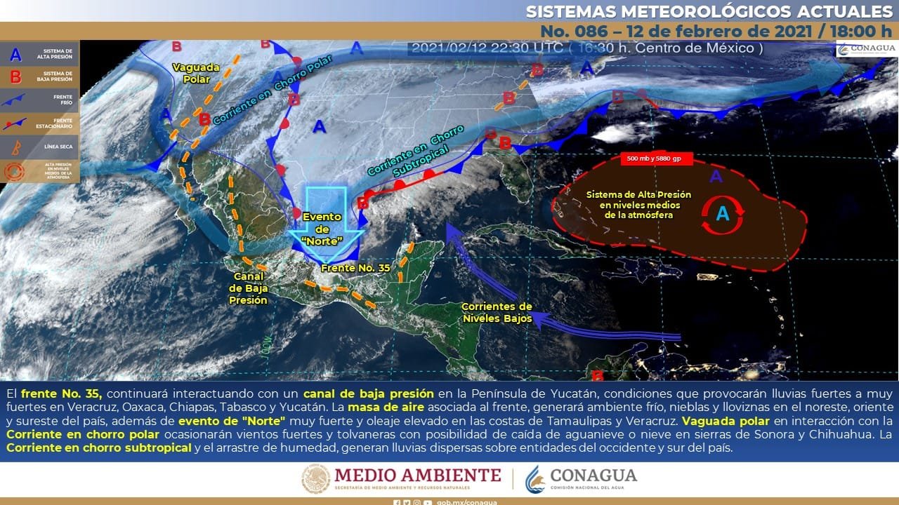 🔊 Escuchar esto Guanajuato continuará este sábado bajo los efectos de la masa de aire frío y tendrá mínimas de 3 grados promedio en la mayor parte de su territorio, dio a conocer el Servicio Meteorológico Nacional (SMN). De acuerdo con su último reporte, el organismo dependiente de la Comisión Nacional del Agua (Conagua) pronostica que para la Mesa Central del país se espera cielo parcialmente nublado con lluvias puntuales fuertes en los estados de Puebla y chubascos en Hidalgo y Querétaro. Se espera ambiente frío por la mañana y templado durante la tarde, mientras que se presentarán rachas de viento de 50 a 60 km/h en Guanajuato, Querétaro, Hidalgo, Tlaxcala y Puebla. GUANAJUATO BAJO VIENTO Y FRÍO El reporte indica que Guanajuato tendrá pocos cambios con respecto al viernes, pues se esperan cielos despejados con máximas de 23 grados promedio en los municipios de León, Guanajuato capital, Dolores Hidalgo, Celaya, Comonfort, Salamanca e Irapuato. Las mínimas en estos municipios seguirán entre 3 y 4 grados con rachas de viento desde el mediodía hasta la noche. Municipios del noreste como San Felipe, San Luis de la Paz e incluso San Miguel de Allende tendrán máximas de 22 grados y mínimas de 2 grados promedio. FRENTE FRÍO ESTACIONARIO Para el resto del país, el SMN dijo que el frente No. 35 se extenderá como estacionario sobre el norte, oriente, centro y sureste del territorio nacional, ocasionando chubascos y lluvias fuertes sobre el noreste, oriente y sureste del país. Por su parte, la masa de aire frío asociada mantendrá el evento de “Norte” fuerte a muy fuerte sobre el litoral de Tamaulipas y Veracruz, así como ambiente frío y presencia de bancos de niebla sobre la Sierra Madre Oriental. VAGUADA TRAERÁ FUERTES VIENTOS La vaguada polar recorrerá el norte del país y en interacción con el frente No. 35 y su masa de aire asociada ocasionarán vientos muy fuertes con tolvaneras sobre entidades del noroeste y norte del territorio nacional. Se pronostica probabilidad de aguanieve o nieve sobre las sierras de Sonora y Chihuahua, se pronostica que durante la noche del sábado, la vaguada avance hacia el sur de Estados Unidos y deje de afectar al territorio nacional al final de día. FRÍO MATUTINO Corriente en chorro subtropical ocasionará vientos fuertes y arrastre de humedad con posibles lluvias aisladas sobre entidades del occidente, centro y sur del país. Mientras que en las zonas altas de la Mesa del Norte y la Mesa Central, durante la noche y la madrugada se pronostica ambiente frío a muy frío con presencia de heladas matutinas. Los fenómenos mencionados ocasionarán este sábado: Intervalos de chubascos con lluvias puntuales fuertes (25 a 50 mm) acompañadas de descargas eléctricas y rachas fuertes de viento en los estados de Tamaulipas, Puebla, Veracruz (zona montañosa central), Campeche, Yucatán y Quintana Roo. Intervalos de chubascos (5.1 a 25 mm) acompañados de descargas eléctricas, rachas fuertes de viento y posible caída de granizo en Chihuahua, Coahuila, Nuevo León, San Luis Potosí, Querétaro, Hidalgo, Oaxaca, Tabasco y Chiapas. Lluvias aisladas (0.1 a 5.0 mm) en Baja California, Sonora, Durango, Nayarit, Jalisco y Colima. Posible caída de aguanieve o nieve en sierras de Sonora, Chihuahua y Coahuila. Viento con rachas de 80 a 100 km/h y tolvaneras en Chihuahua. Viento con rachas de 60 a 80 km/h en el Golfo de California y con tolvaneras en Baja California, Baja California Sur, Sonora y Durango. Viento con rachas de 50 a 60 km/h en Nuevo León, Zacatecas, San Luis Potosí, Guanajuato, Querétaro, Hidalgo, Tlaxcala, Puebla, Yucatán y Quintana Roo. Evento de “Norte” con rachas de 60 a 70 km/h en litoral de Tamaulipas y Veracruz. Oleaje elevado de 1 a 3 metros de altura significante en costa occidental de Baja California, costas de Tamaulipas y Veracruz. Temperaturas máximas de 35 a 40°C en Morelos, Guerrero, Michoacán, Oaxaca, Chiapas, Campeche, Yucatán y Quintana Roo. Temperaturas mínimas para la madrugada del lunes de -15 a -10°C con heladas en las zonas montañosas de Chihuahua y Coahuila. Temperaturas mínimas para la madrugada del domingo de -10 a -5°C con heladas en las zonas montañosas de Sonora y Durango. Temperaturas mínimas para la madrugada del domingo de -5 a 0°C con heladas en zonas montañosas de Zacatecas, Aguascalientes y Estado de México. Temperaturas mínimas para la madrugada del domingo de 0 a 5°C y posibles heladas en zonas de Baja California, Nuevo León, San Luis Potosí, Jalisco (norte), Guanajuato, Tamaulipas, Hidalgo, Ciudad de México, Tlaxcala, Puebla, Veracruz y Oaxaca. Compartir