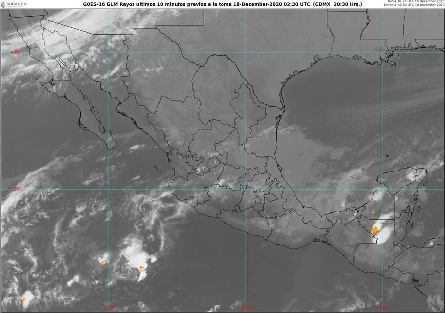 Intervalos de chubascos (5.1 a 25 mm) acompañados de descargas eléctricas y rachas fuertes de viento durante las tormentas en Guerrero, Campeche y Yucatán.