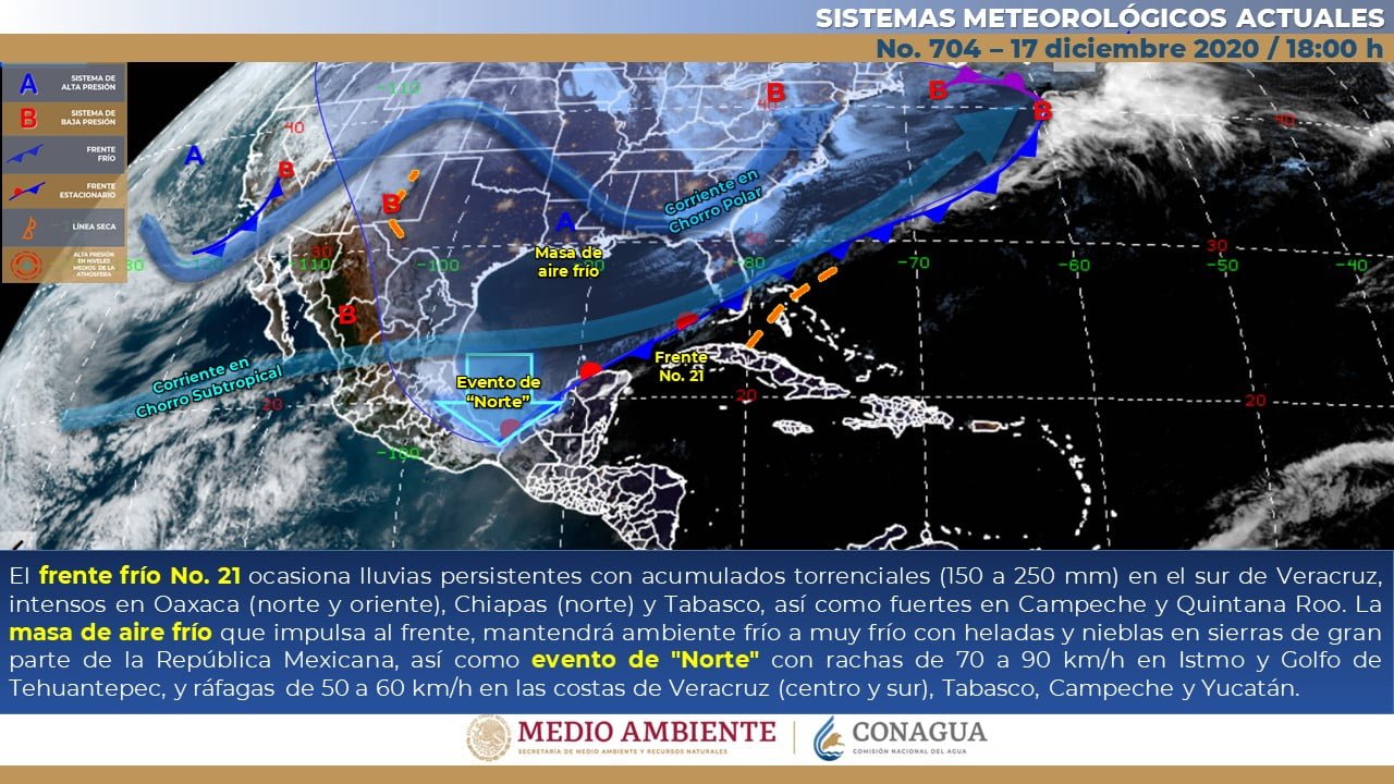 Mientras, una vaguada se extenderá sobre el sur del Golfo de México y sureste del país, ocasionando chubascos y lluvias fuertes a puntuales muy fuertes en dichas regiones. Se prevé que durante el transcurso de la noche el frente No. 21 deje de afectar al país.